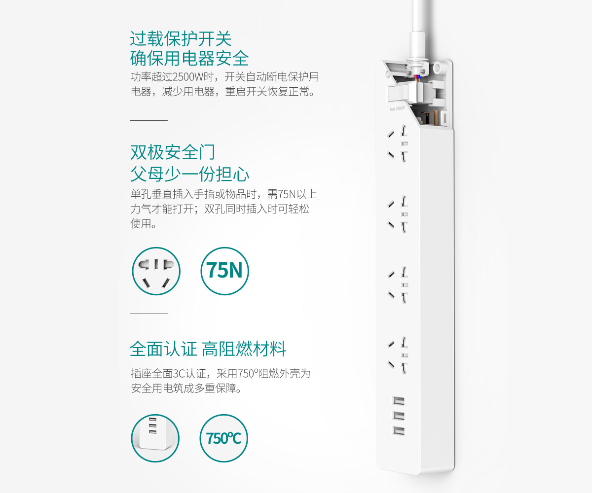 多次购买了,看着身边的亲人用那些十块钱都不到的插排,塑料壳都已经老化用透明胶缠来缠去的,总想给身边的人更多安全吧。其他都好,唯一的不足就是U**接口太紧了,刚开始的插拔很不方便。
