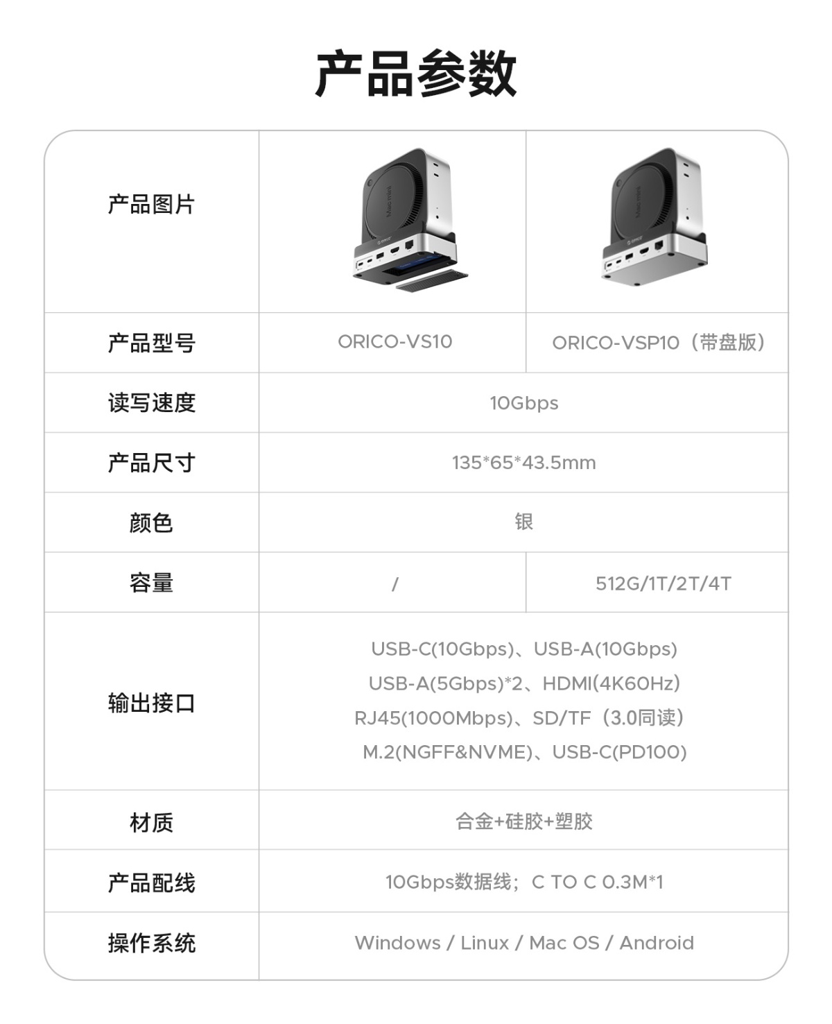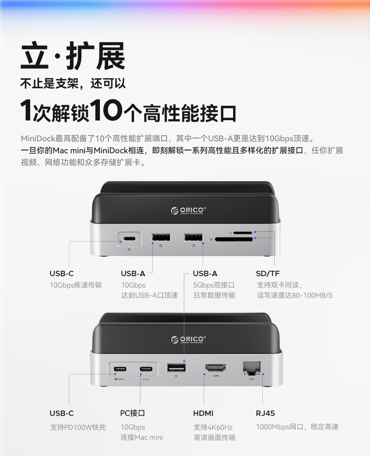 USB-C(10Gbps)、USB-A(10Gbps)、USB-A(5Gbps)*2、HDMI(4K60Hz)、RJ45(1000Mbps)、SD/TF(3.0同读)、M.2(NGFF&NVME)、USB-C(PD100)