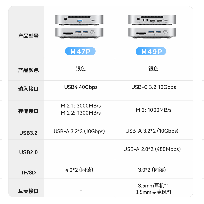 M.2 SSD*1(双协议10Gbps);USB-A 3.2*2(10Gbps); USB-A 2.0*2(480Mbps);3.5mm耳机*1;3.5mm麦克风*1;TF/SD3.0*2(同读)