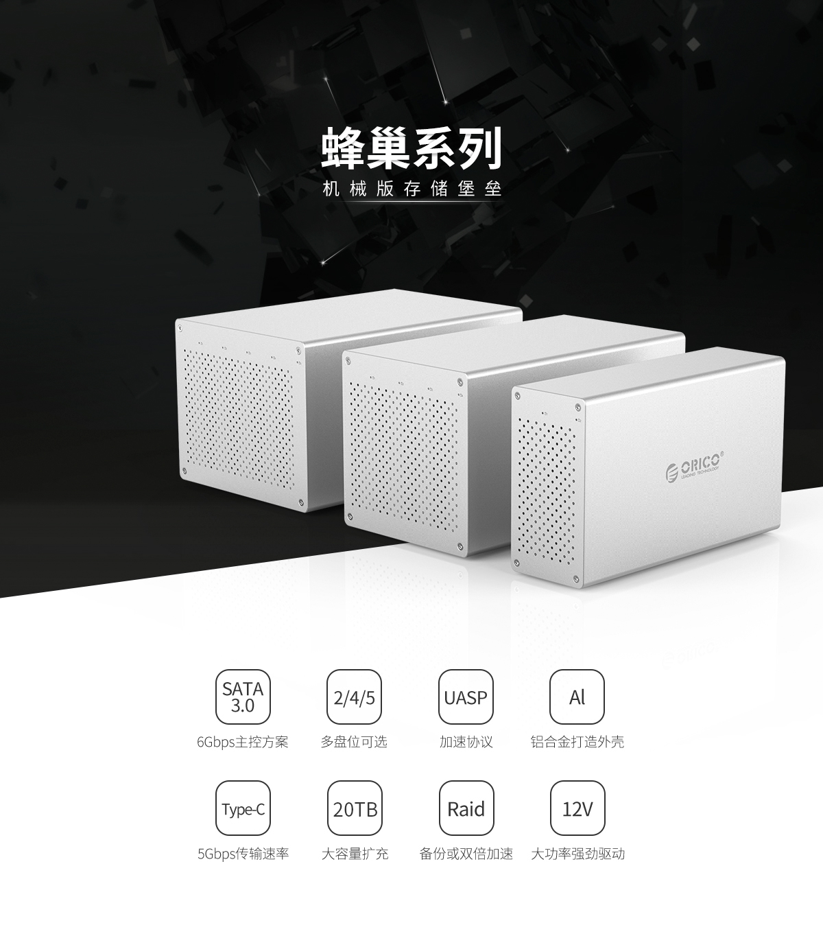 蜂巢系列磁盘阵列,铝合金材质,Type-C磁盘阵列存储硬盘柜