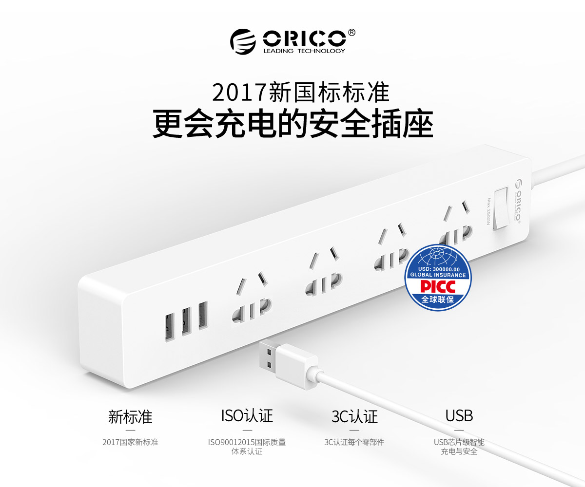 简约款新国标4AC口3usb便携桌面式排插