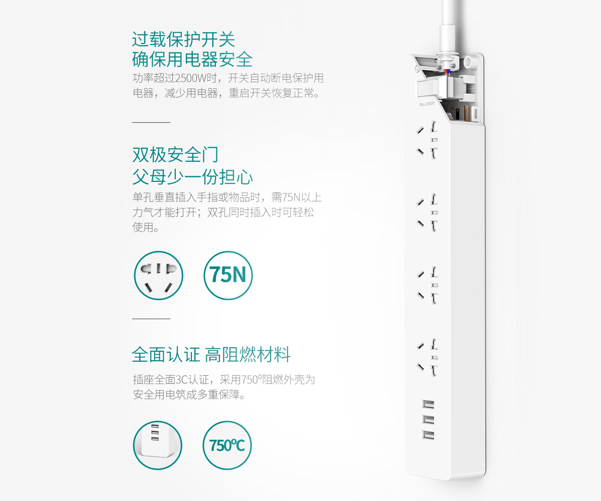 多次购买了,看着身边的亲人用那些十块钱都不到的插排,塑料壳都已经老化用透明胶缠来缠去的,总想给身边的人更多安全吧。其他都好,唯一的不足就是U**接口太紧了,刚开始的插拔很不方便。