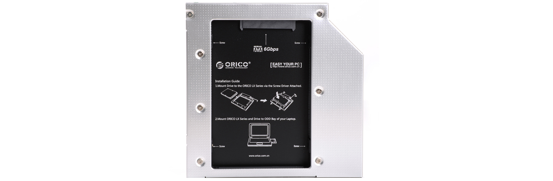 ORICO L127SS笔记本光驱位硬盘托架采用镁铝合金外壳内置塑料框架的设计,金属外壳表面有点阵纹理并采用多枚螺丝固定,背面是表面有点阵纹理并采用多枚螺丝固定的镁铝合金外壳。托架中间位置可安装一个2.5英寸SATA硬盘固态硬盘,通过替换笔记本内置的光驱从而增加存储容量和读写性能。