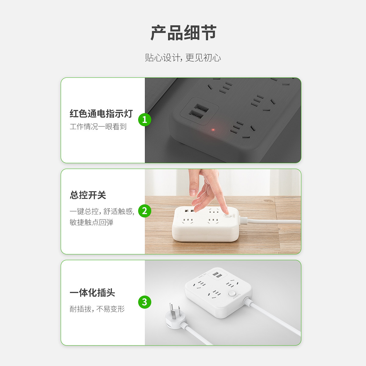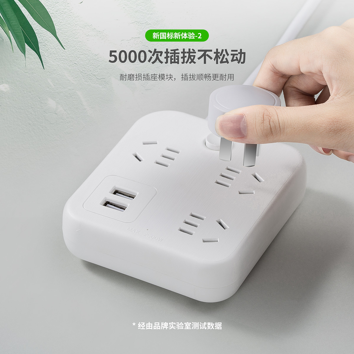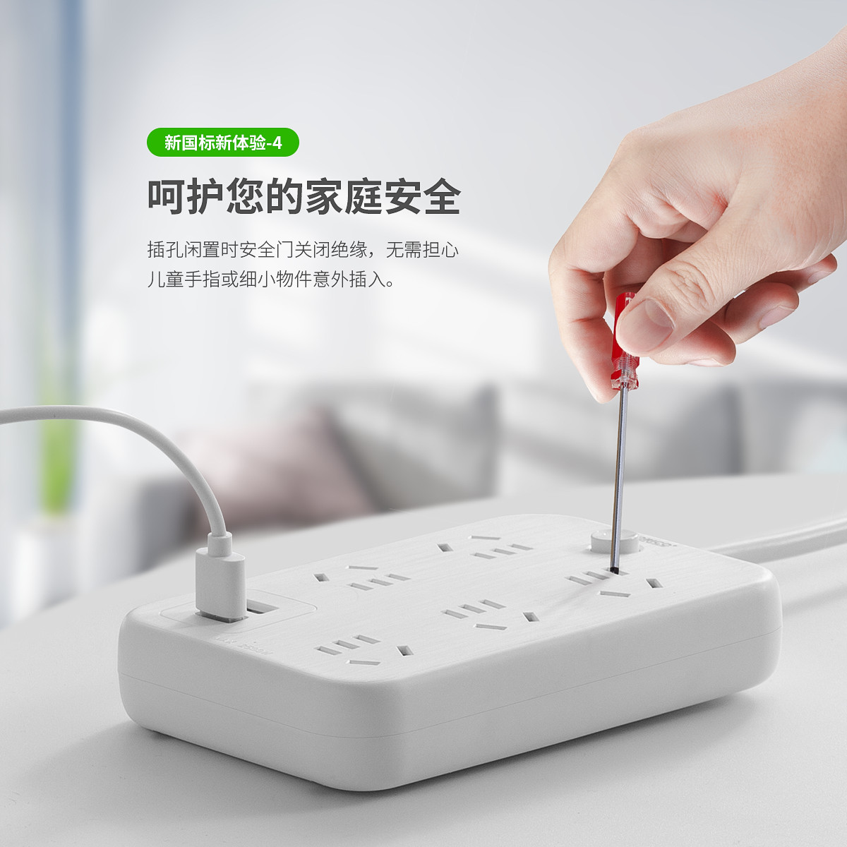 多孔位安全排插,一体冲压成型,5000次插拔不松动,手机无需充电头,拉丝面板,3年质保
