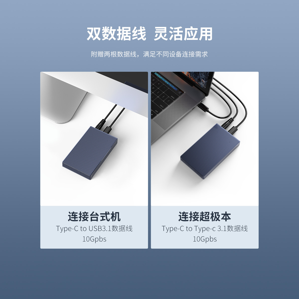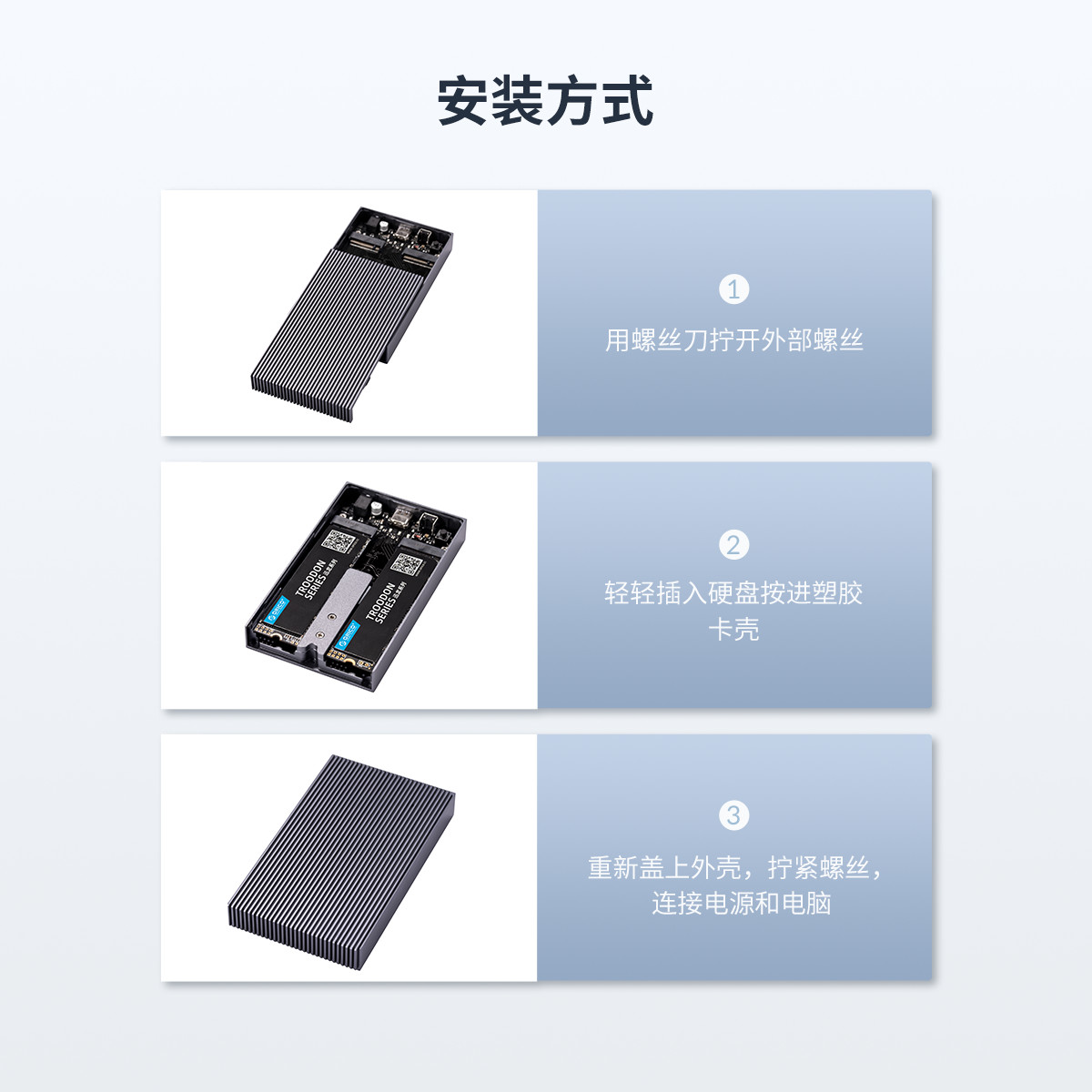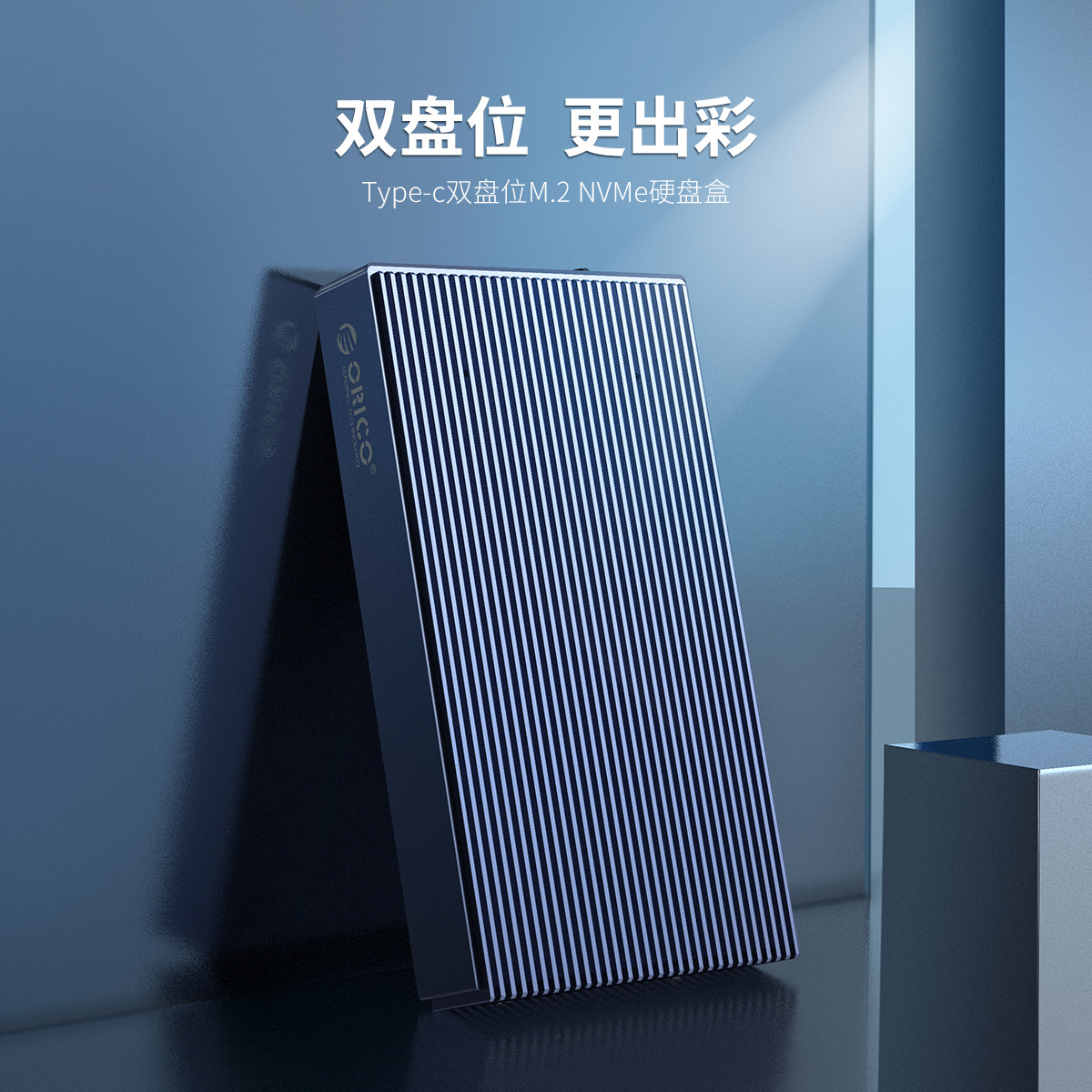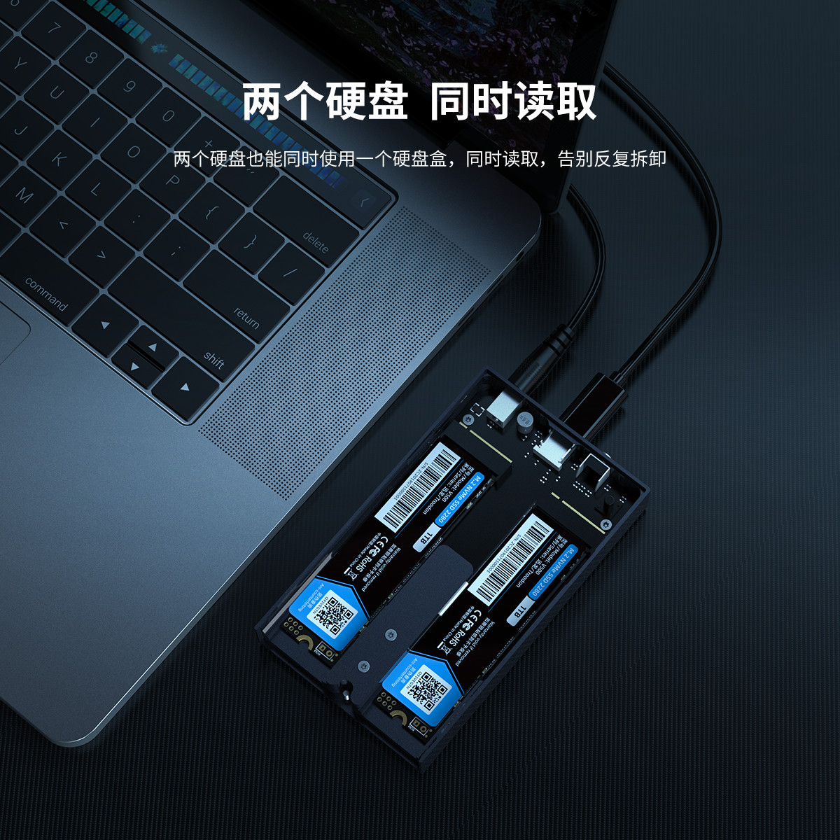 Type-c双盘位M.2 NVMe硬盘盒,利用条纹散热棱扩大散热面积,双盘位4TB