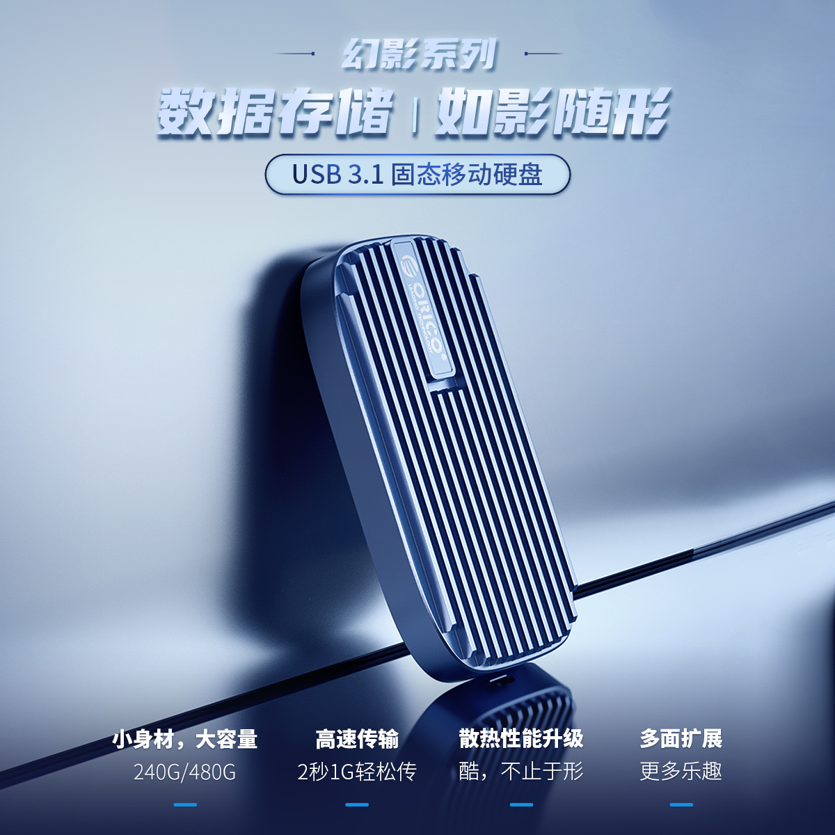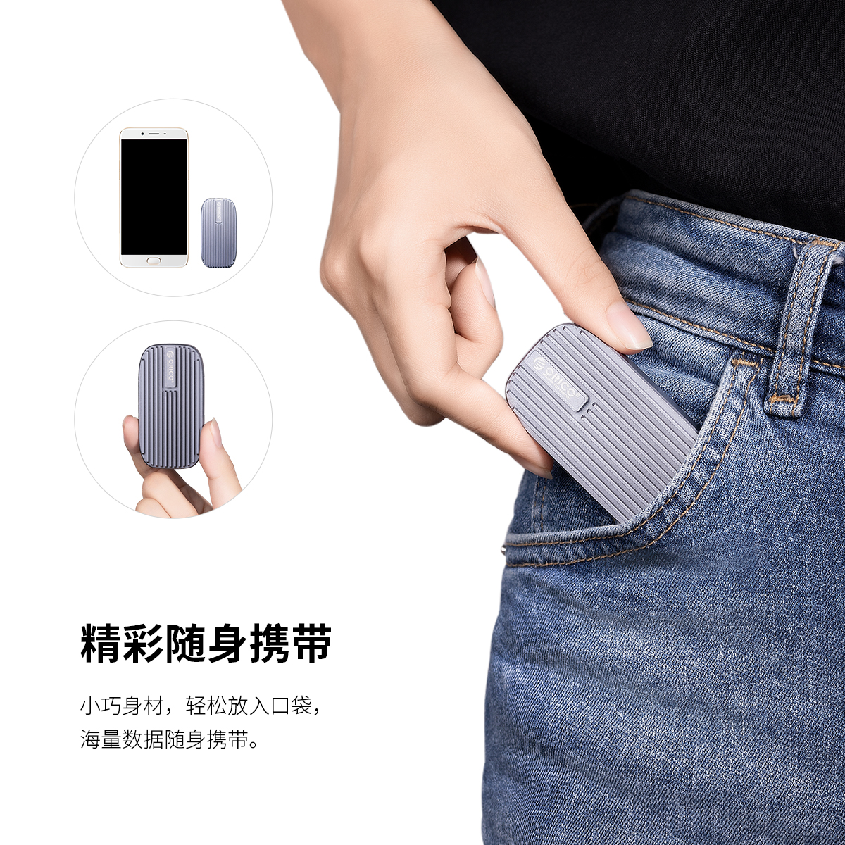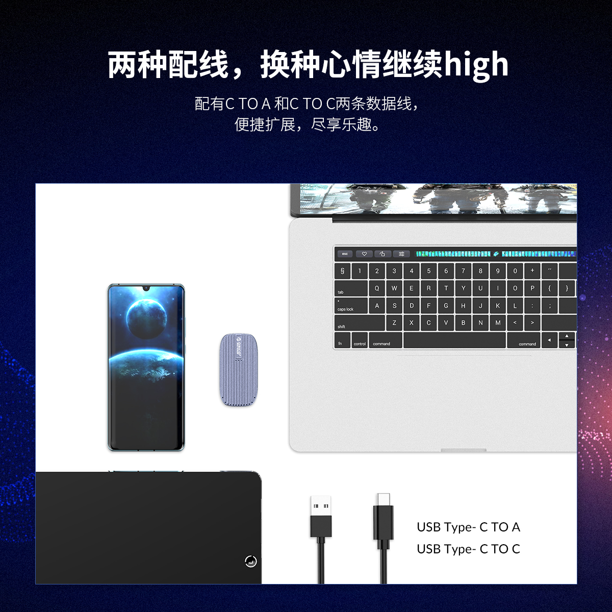 USB 3.1固态移动硬盘,OTG功能,支持UASP加速协议,52OMB/s强劲动力,配有一条CTOA和C TOC二合一数据线,