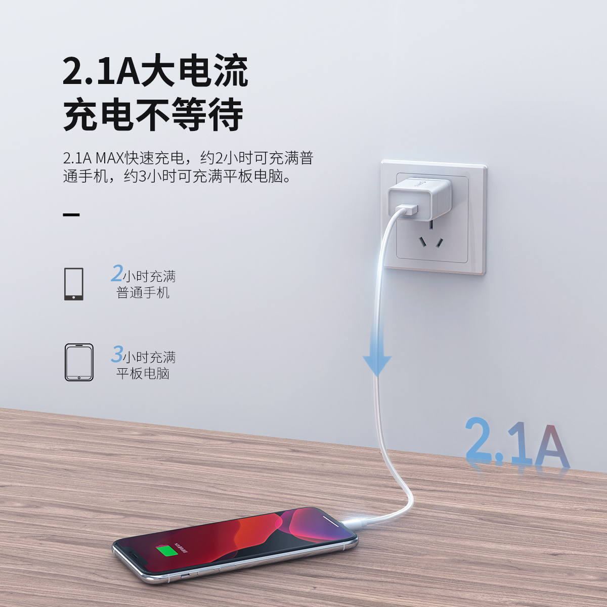 1OWUSB充电器, 2.1A MAX快速充电, 3C认证 ,过流保护 ,过压保护 ,短路保护,耐高温防火阻燃材质