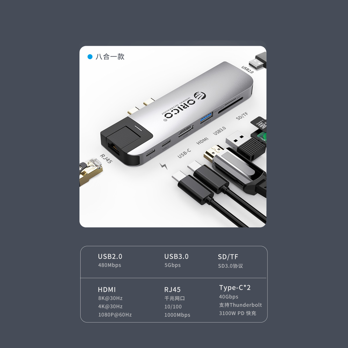 USB3.0*1+USB2.0*1+SD/TF+HDMI+RJ45+Type-C+Type-C(支持Thunderbolt3)