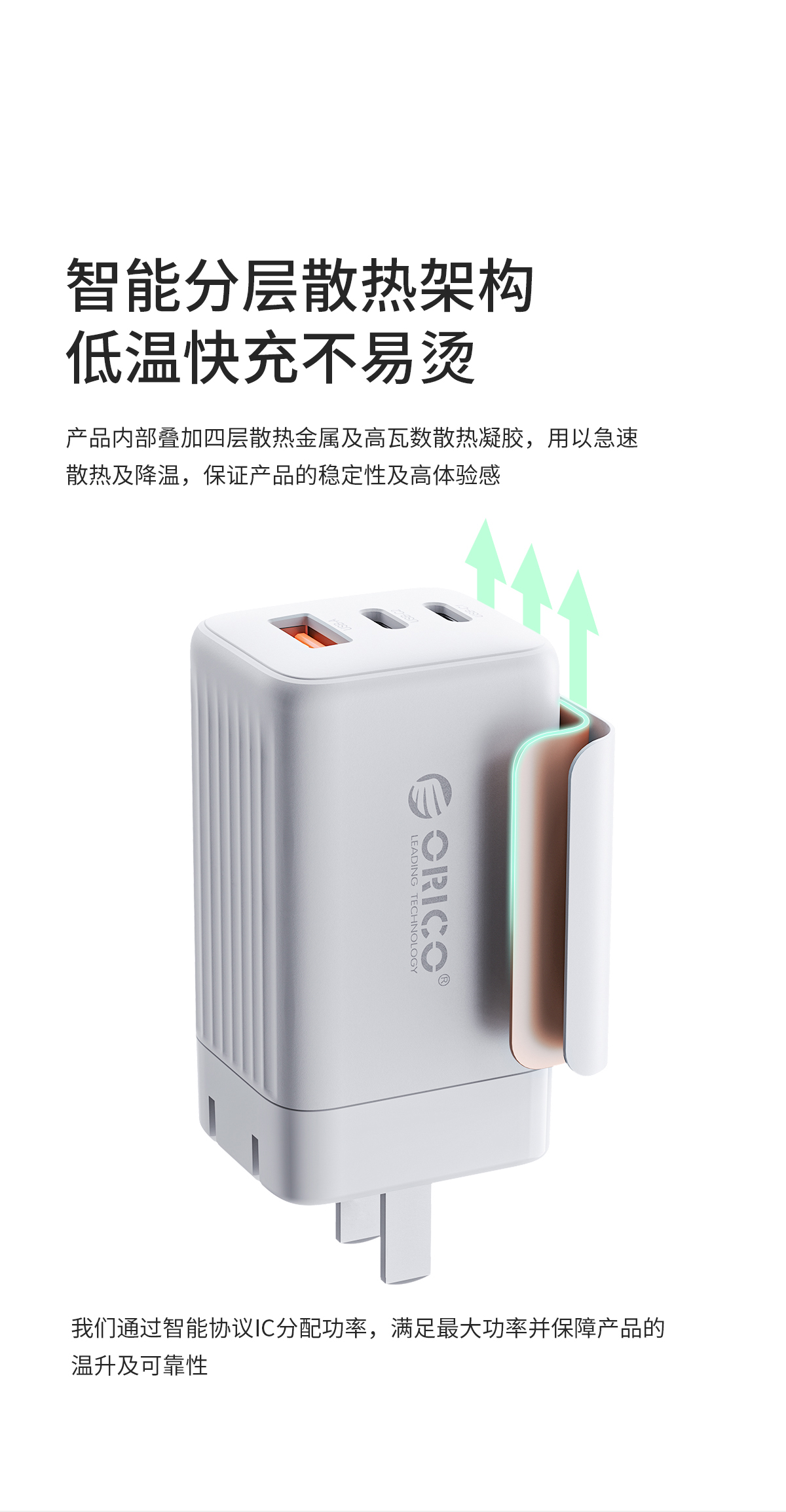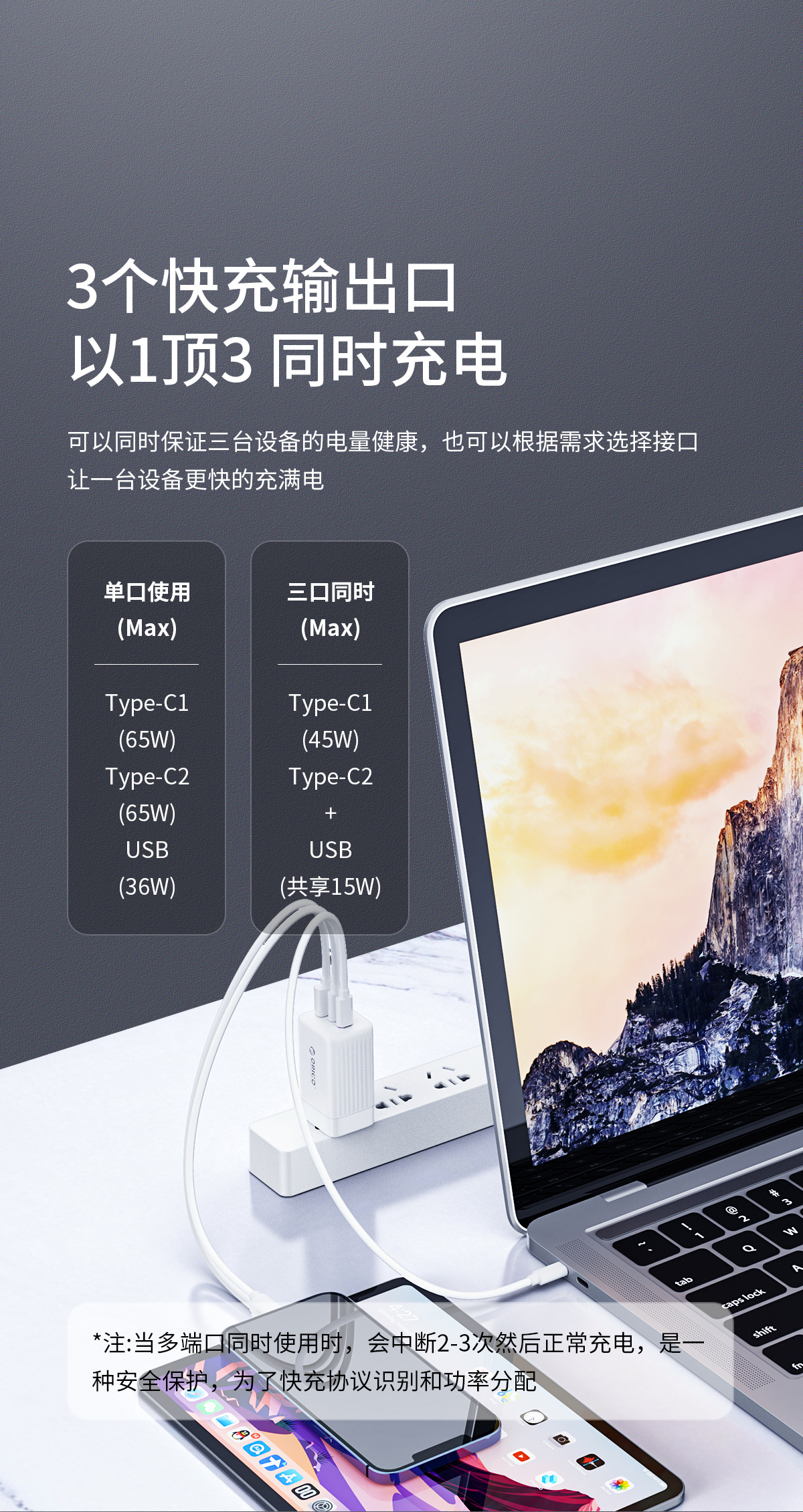 C1+C2 : C1 PD45W+C2 PD20W; C1+A1 :C1 PD45W +A1 QC18W;C2+A1:共享 5V3A;C1+C2+A1:C1 PD45W +C2 和 A1 共享 5V3A