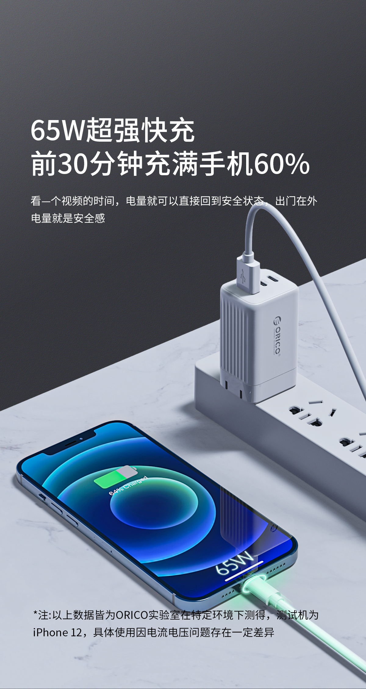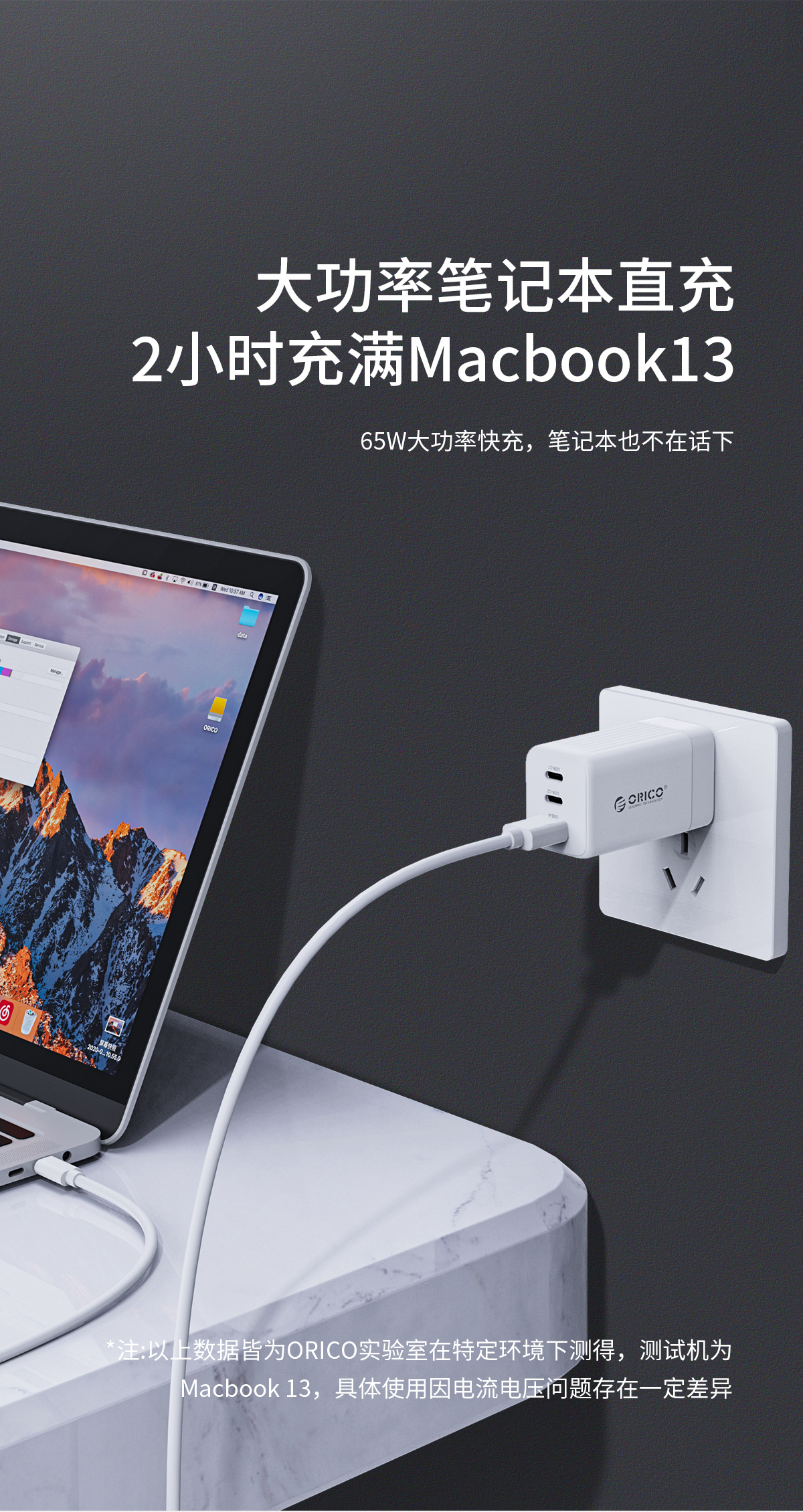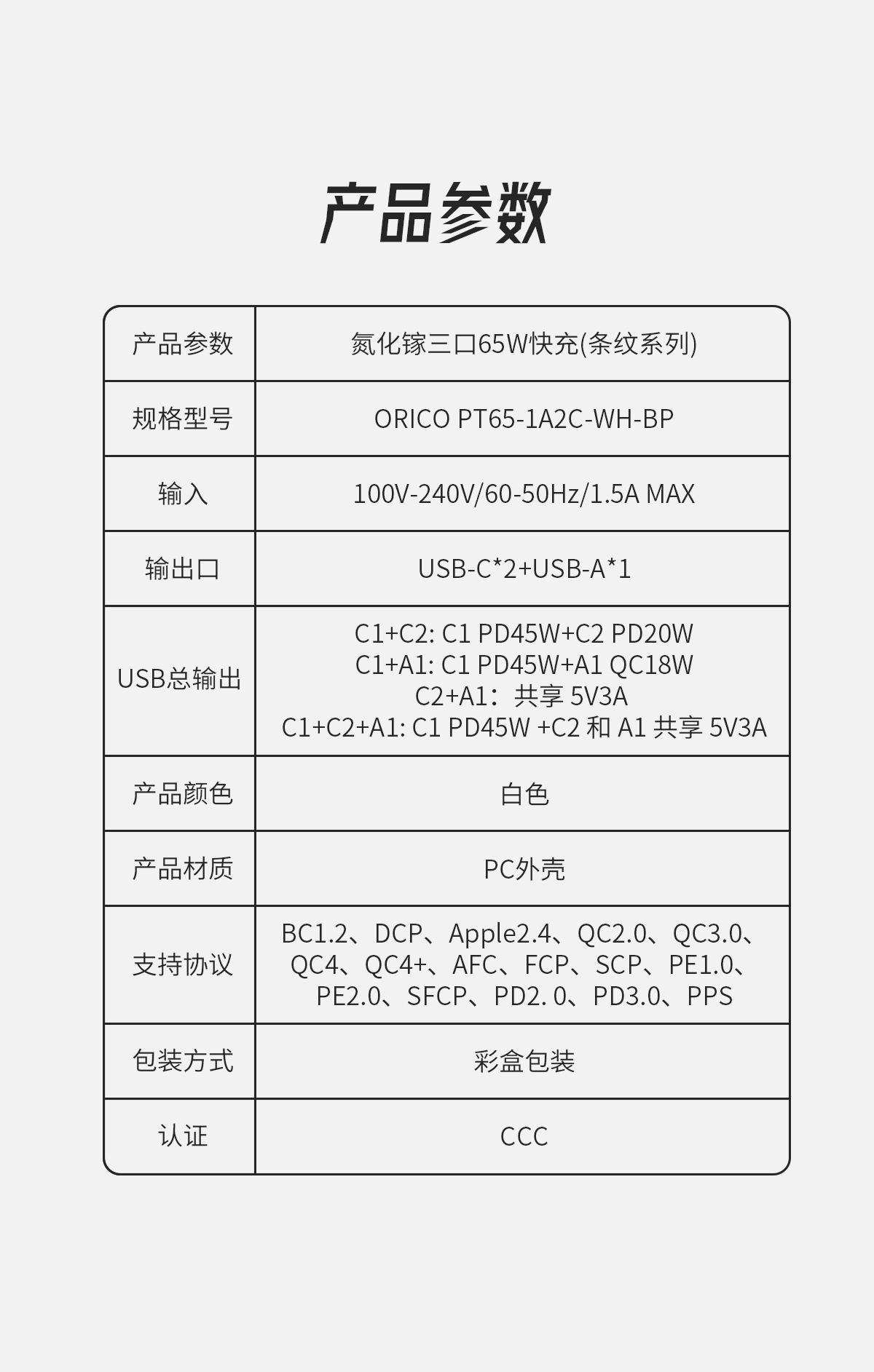 Type-C1 输出 Onput:5V/3.0A、9V/3A、12V/3A、15V/3A、20V/3.25A; Type-C2 输出 Onput:5V/3.0A、9V/3A、12V/3A、15V/3A、20V/3.25A; USB1 输出 Output:4.5V/5A、5V/4.5A、9V/3.0A、12V/3.0A、20V/1.8A; Type-C1+Type-C2+USB1 输出(Total): 65W