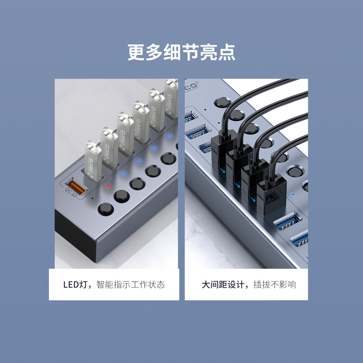 数据:蓝色LED 指示灯;QC充电:红色
