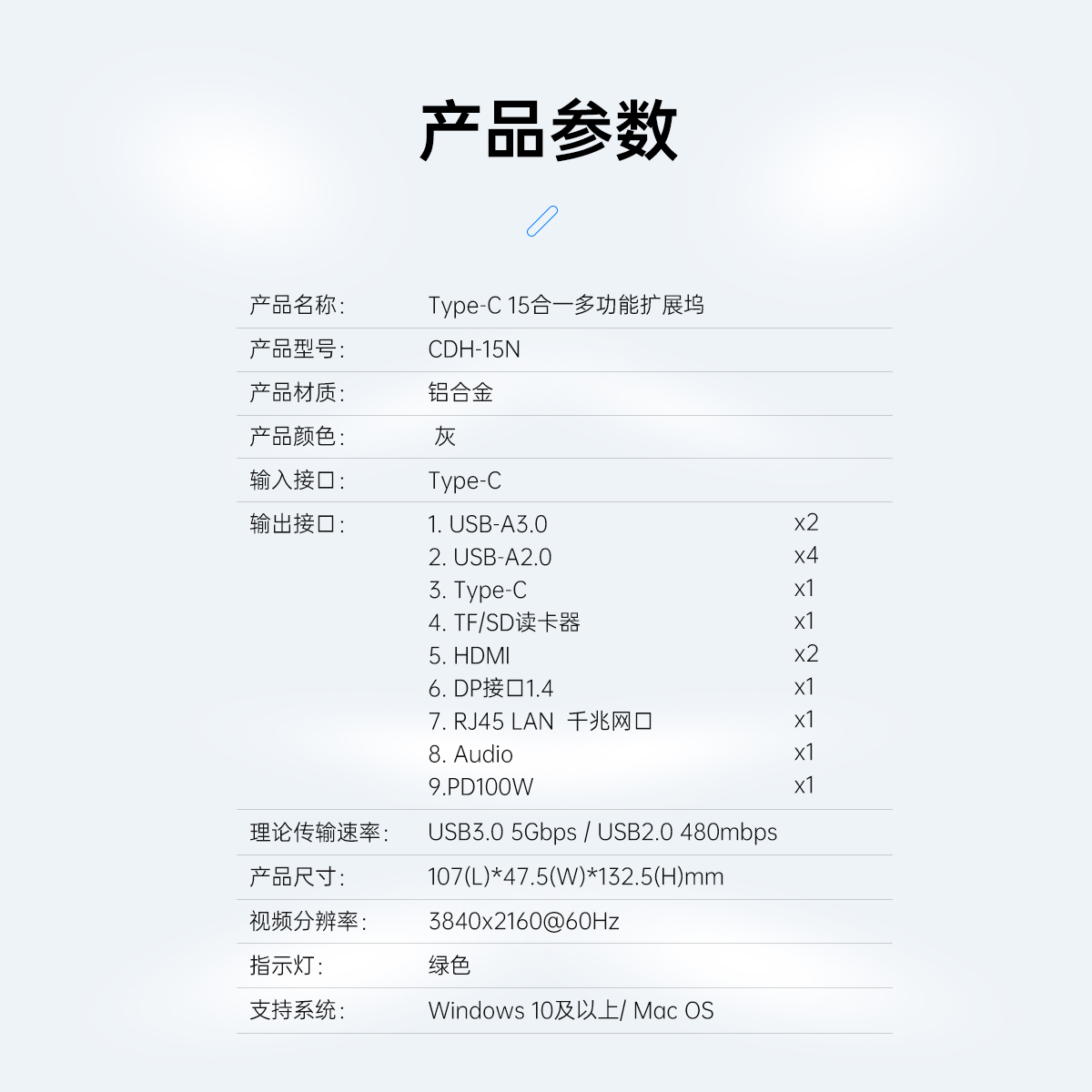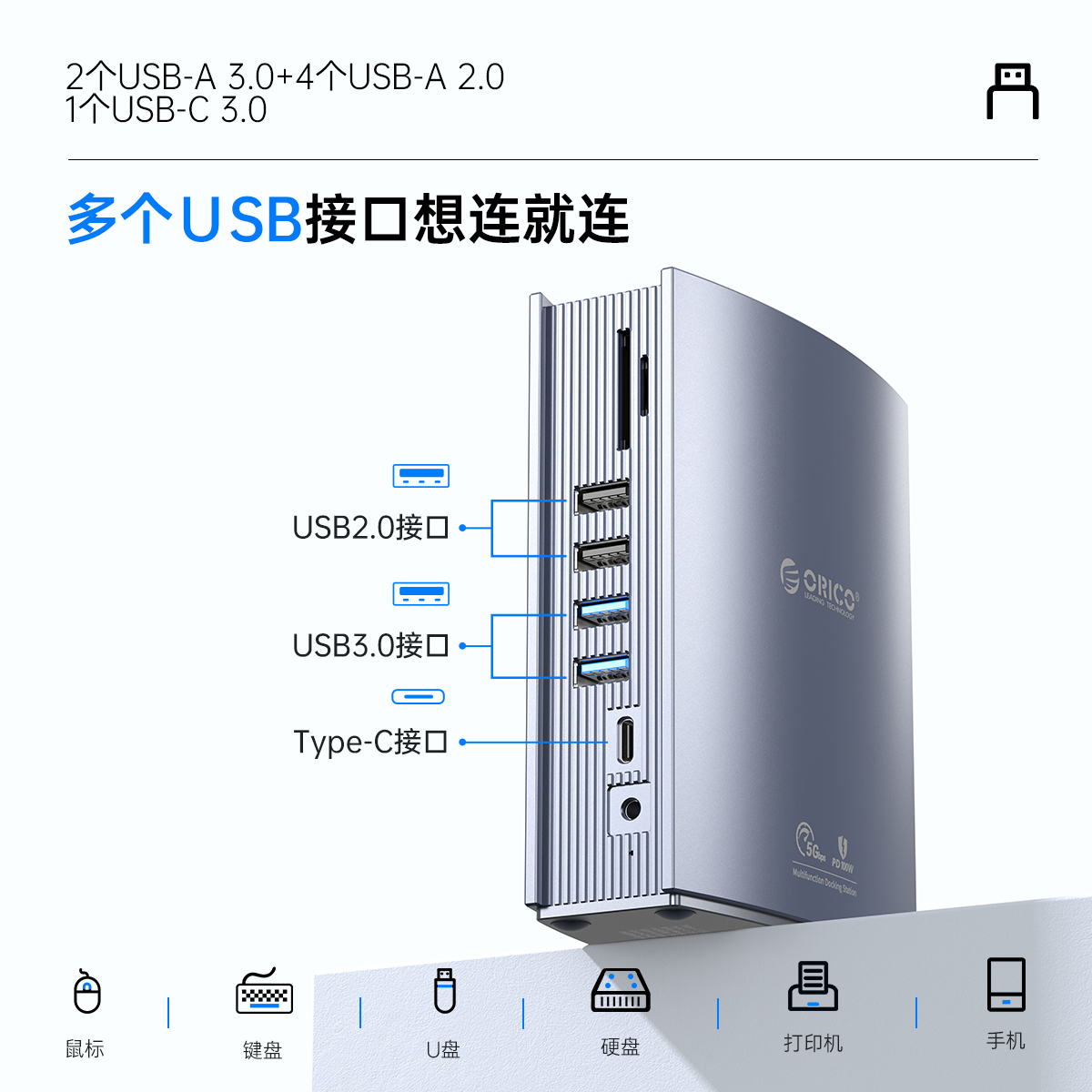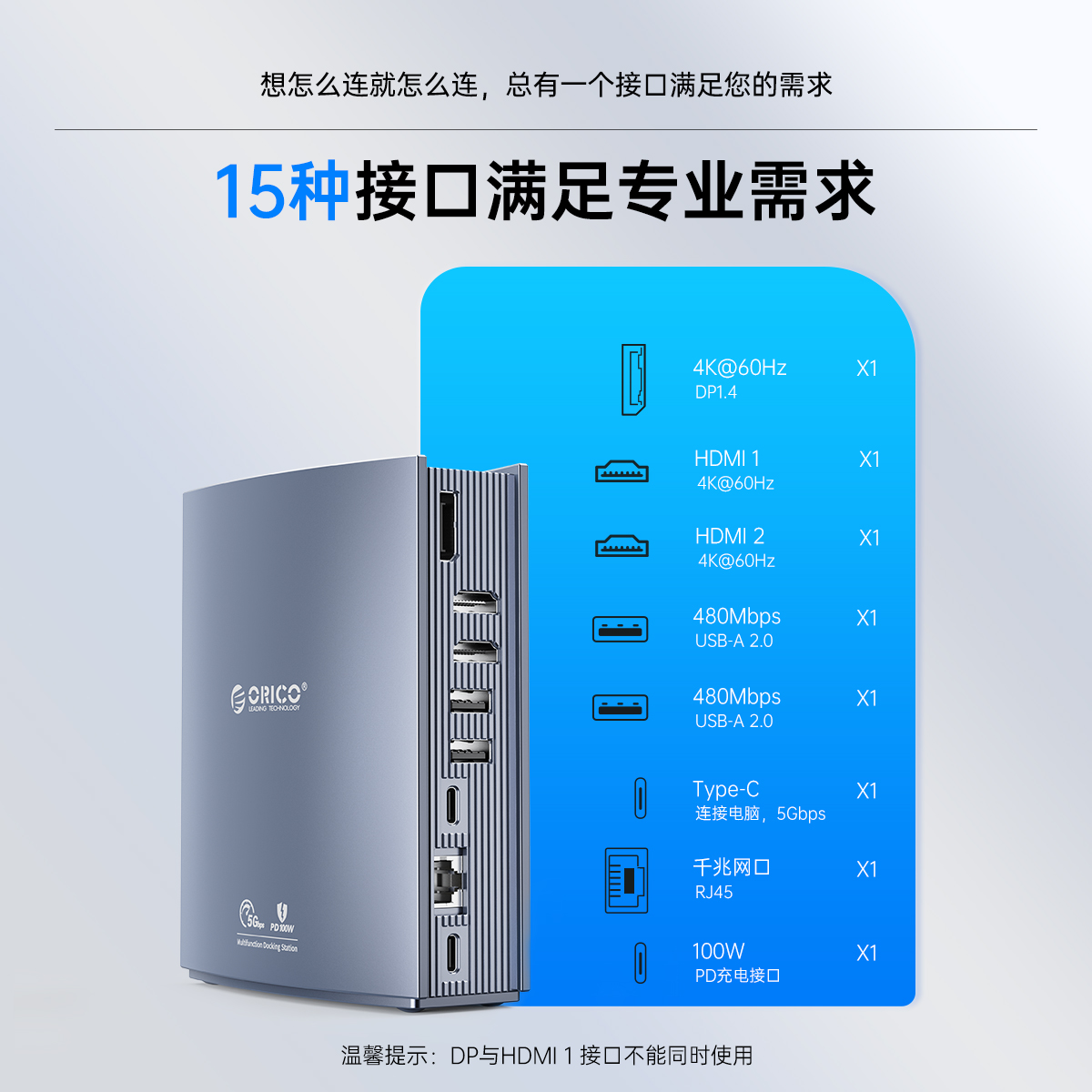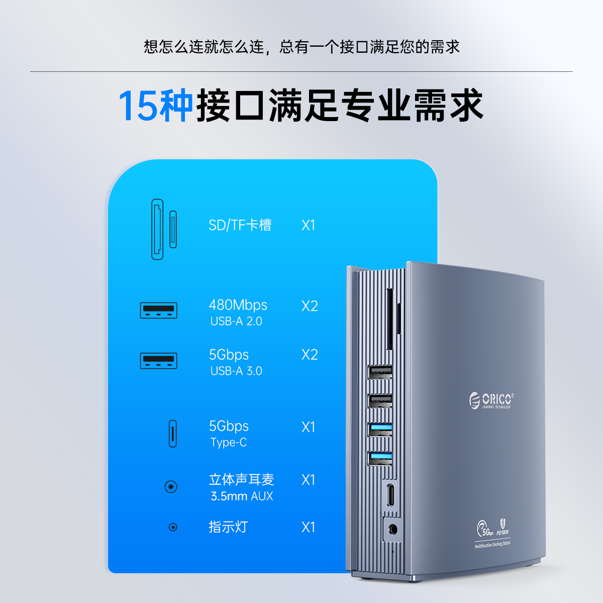 USB-A3.0×2 5GbpsUSB-A2.0×4 480GbpsUSB-C3.0×1 5GbpsTF(microSD)/SD×1 USB2.0双卡单读HDMI×2 4K@60HzDP×1 4K@60HzRJ45×1 千兆Audio×1PD 100W×1
