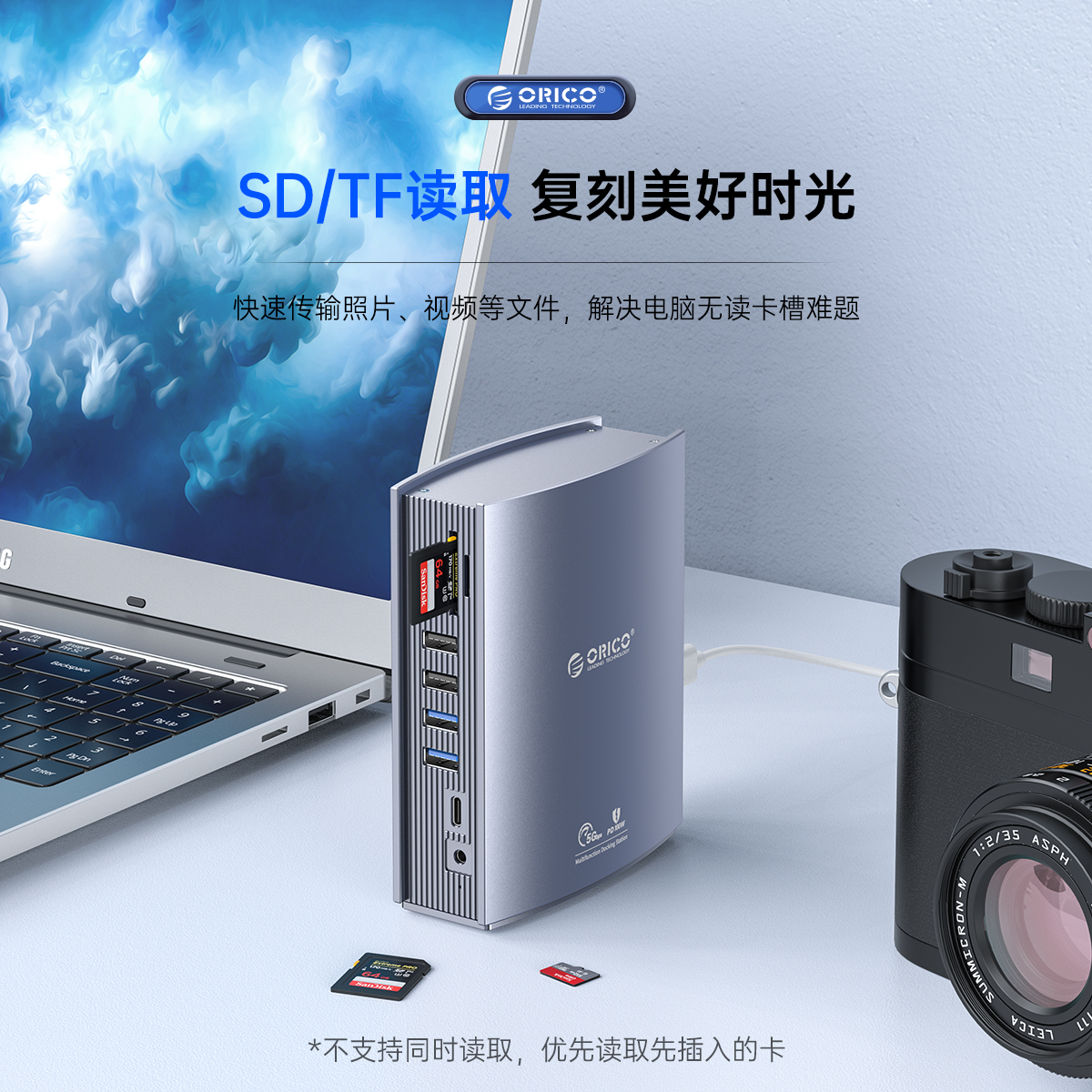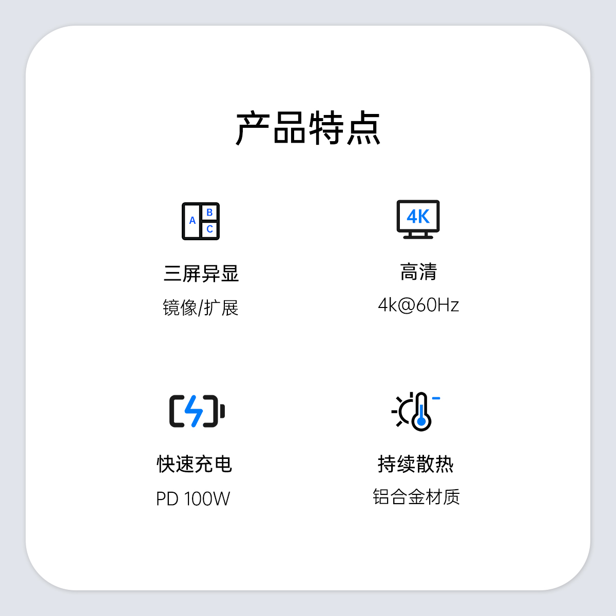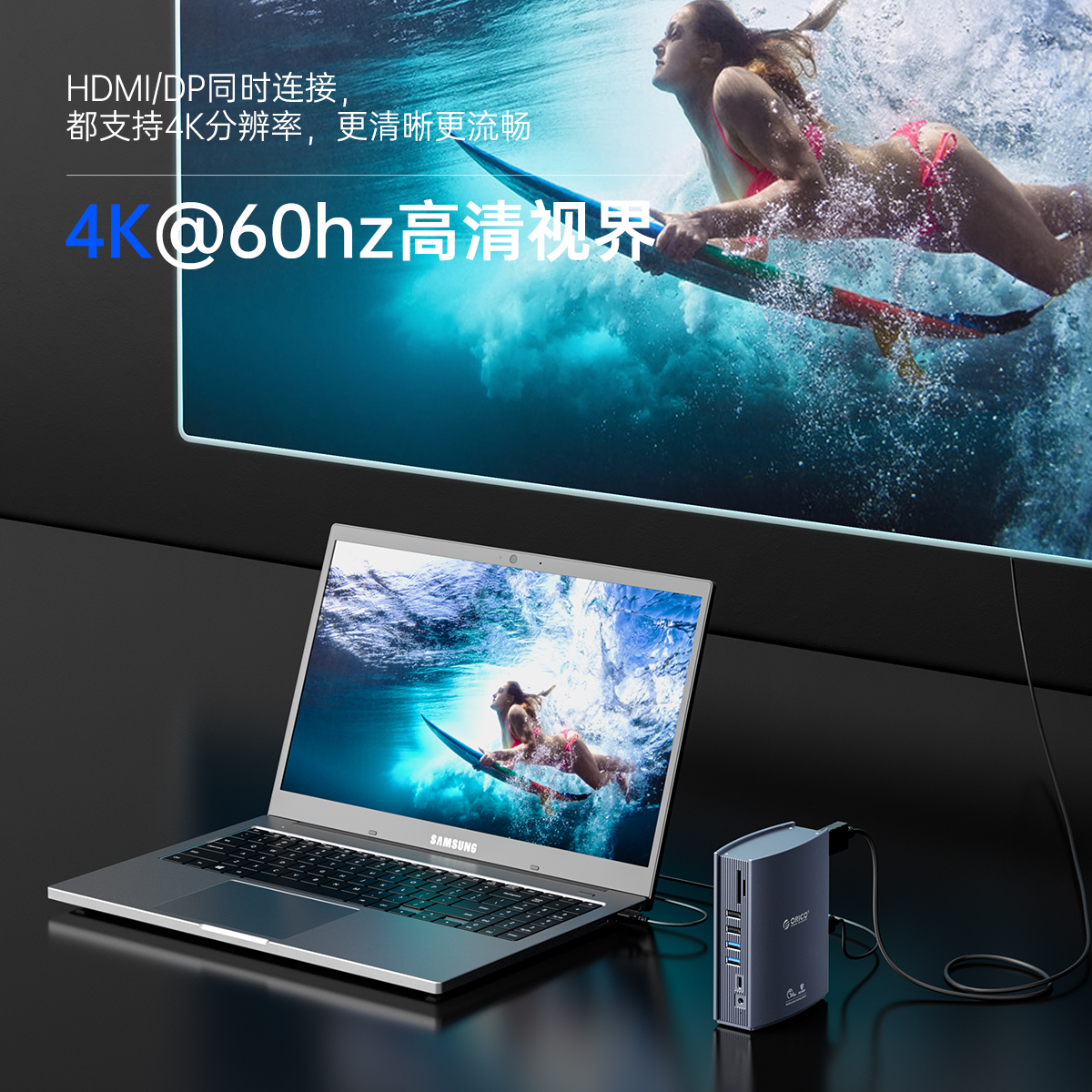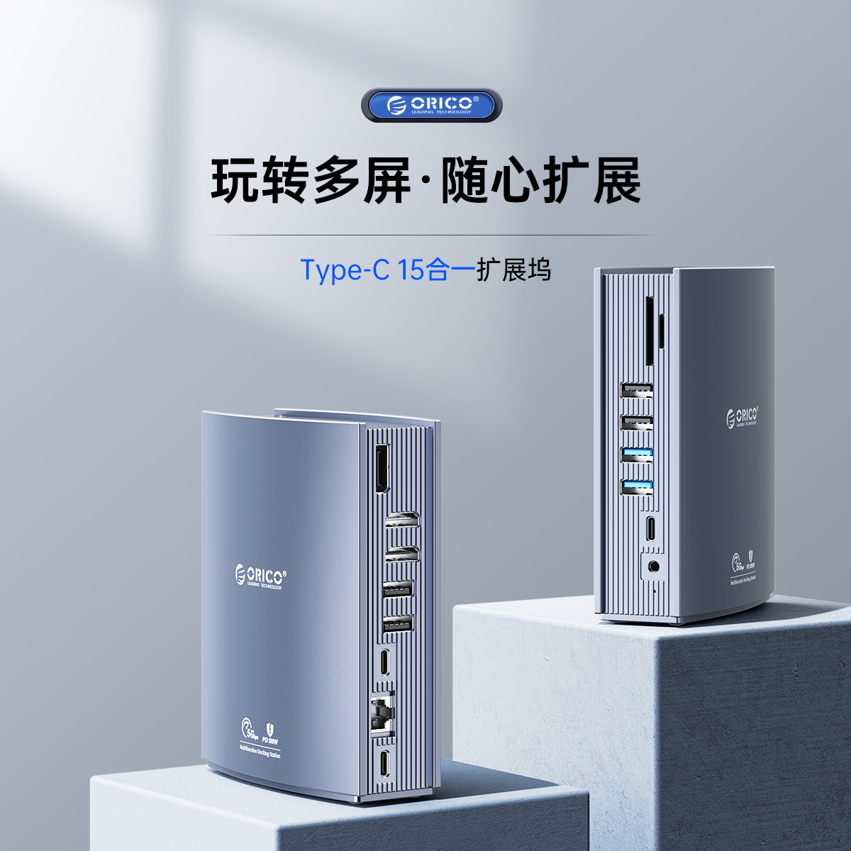 USB-A3.0×2 5GbpsUSB-A2.0×4 480GbpsUSB-C3.0×1 5GbpsTF(microSD)/SD×1 USB2.0双卡单读HDMI×2 4K@60HzDP×1 4K@60HzRJ45×1 千兆Audio×1PD 100W×1