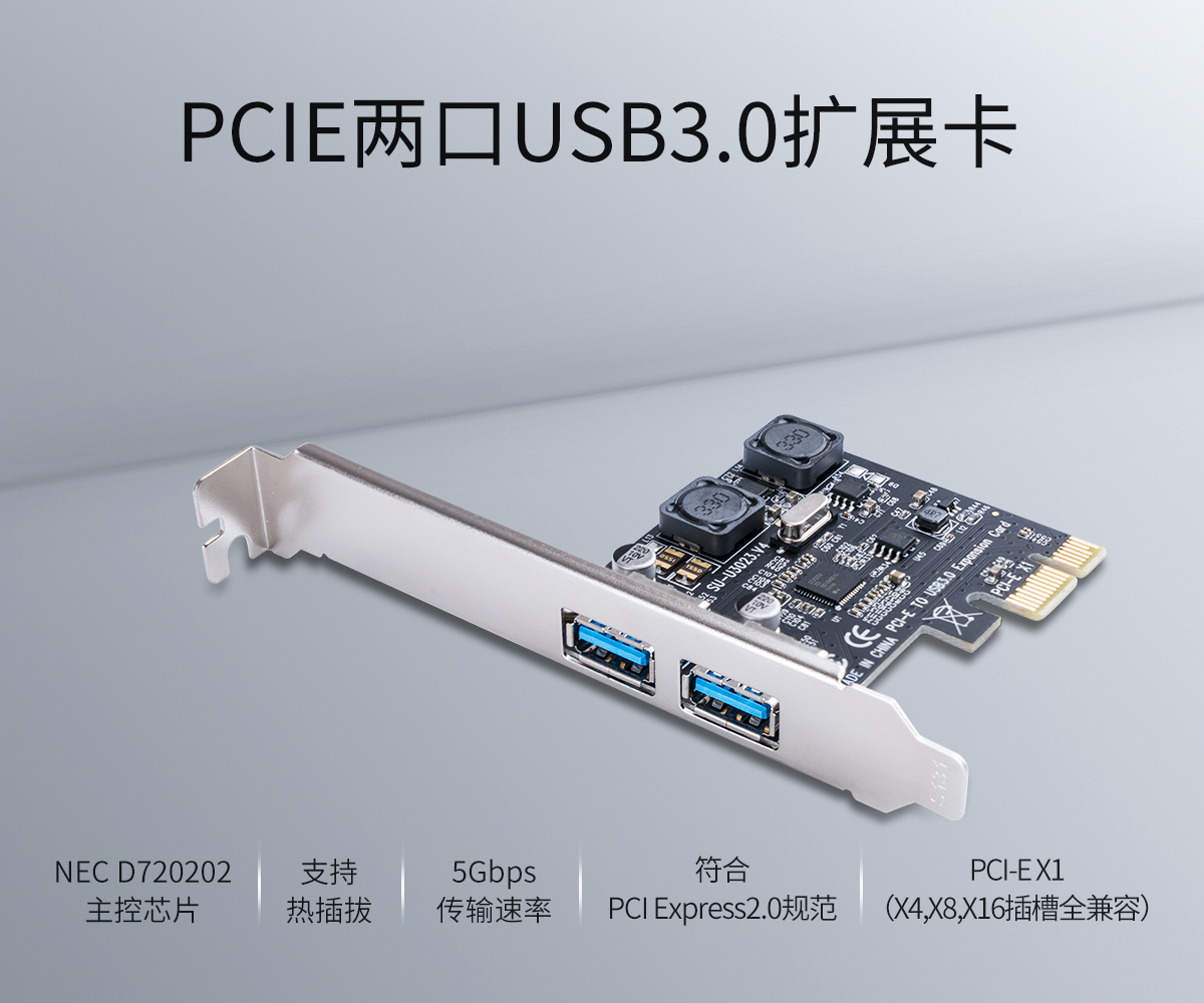 2口USB3.0 台式机PCI-E扩展卡,PCI-E ×4/×8/×16全兼容