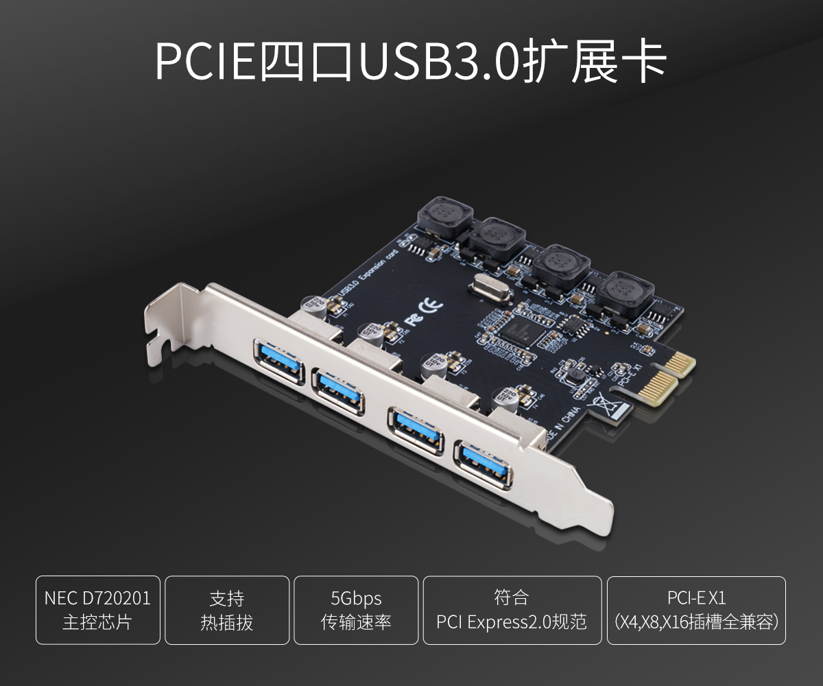 4口USB3.0 台式机PCI-E扩展卡,兼容PCI-E X4/8/16