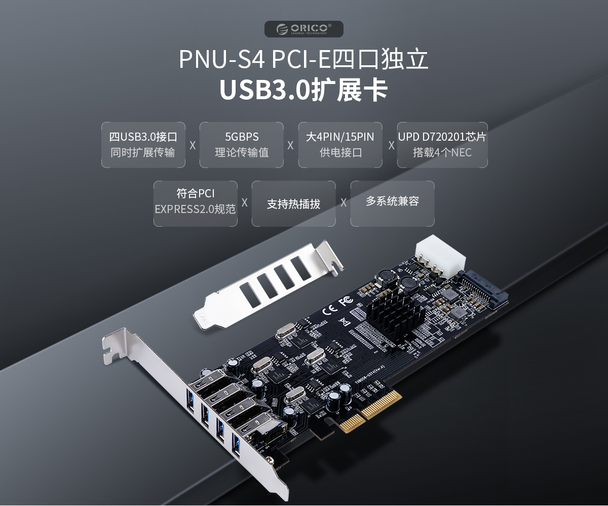4口USB3.0 台式机PCI-E扩展卡,兼容PCI-E X4/8/16