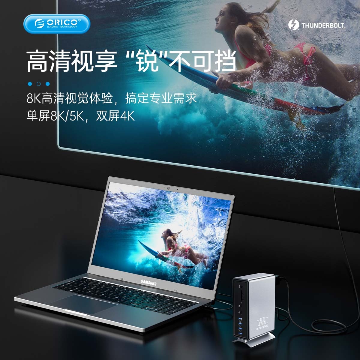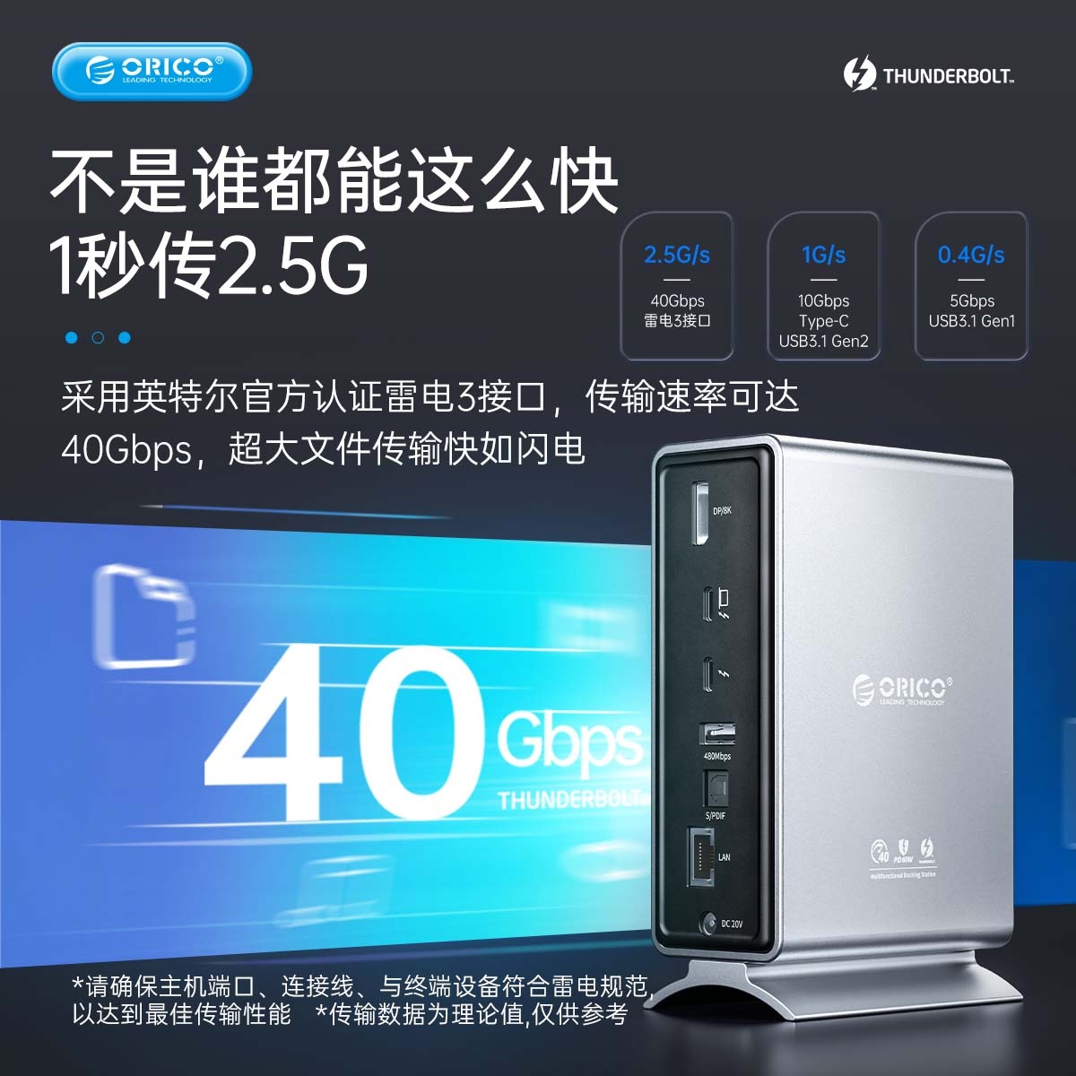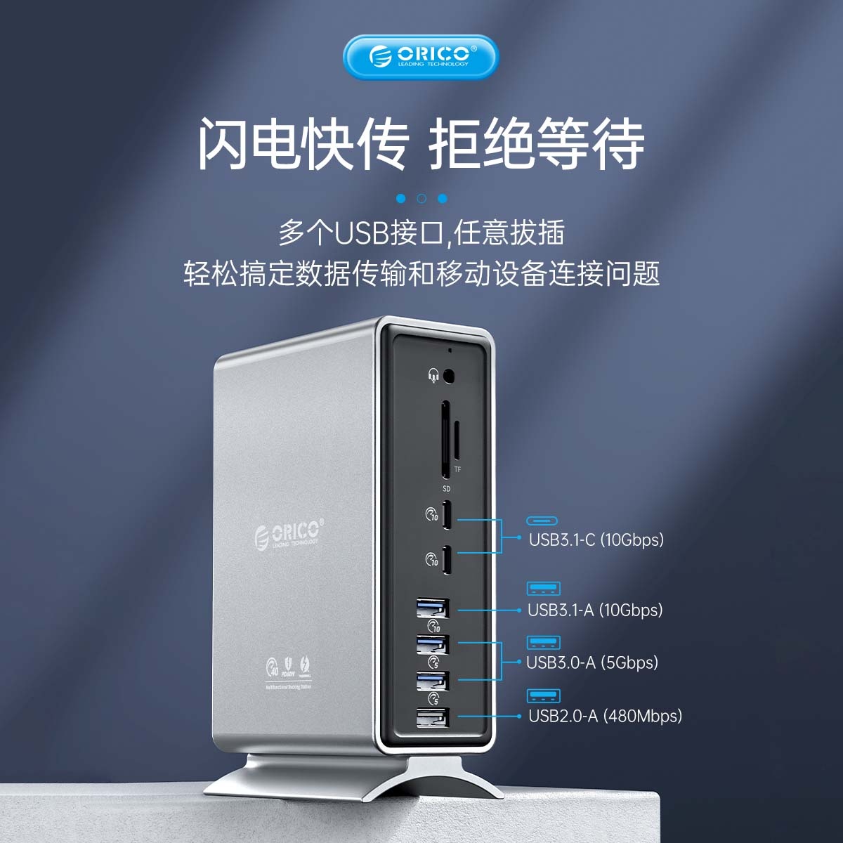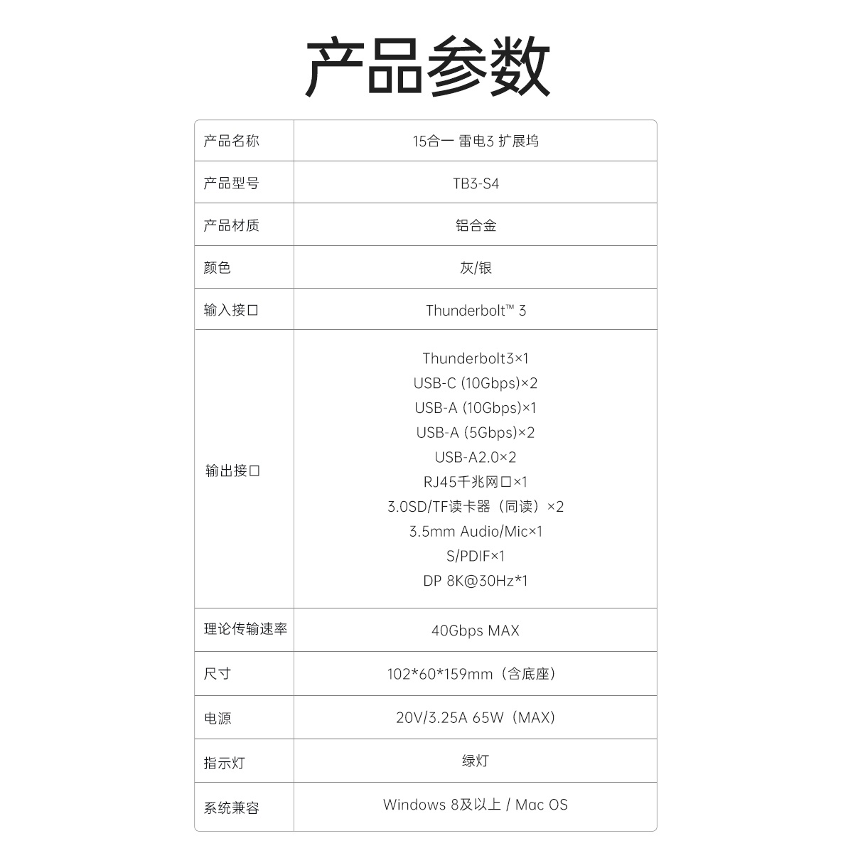Thunderbolt3×1、USB-C (10Gbps)×2、USB-A (10Gbps)×1、USB-A (5Gbps)×2、USB-A2.0×2、RJ45千兆网口×1、3.0SD/TF读卡器(同读)×2、3.5mm Audio/Mic×1、S/PDIF×1、DP 8K@30Hz*1