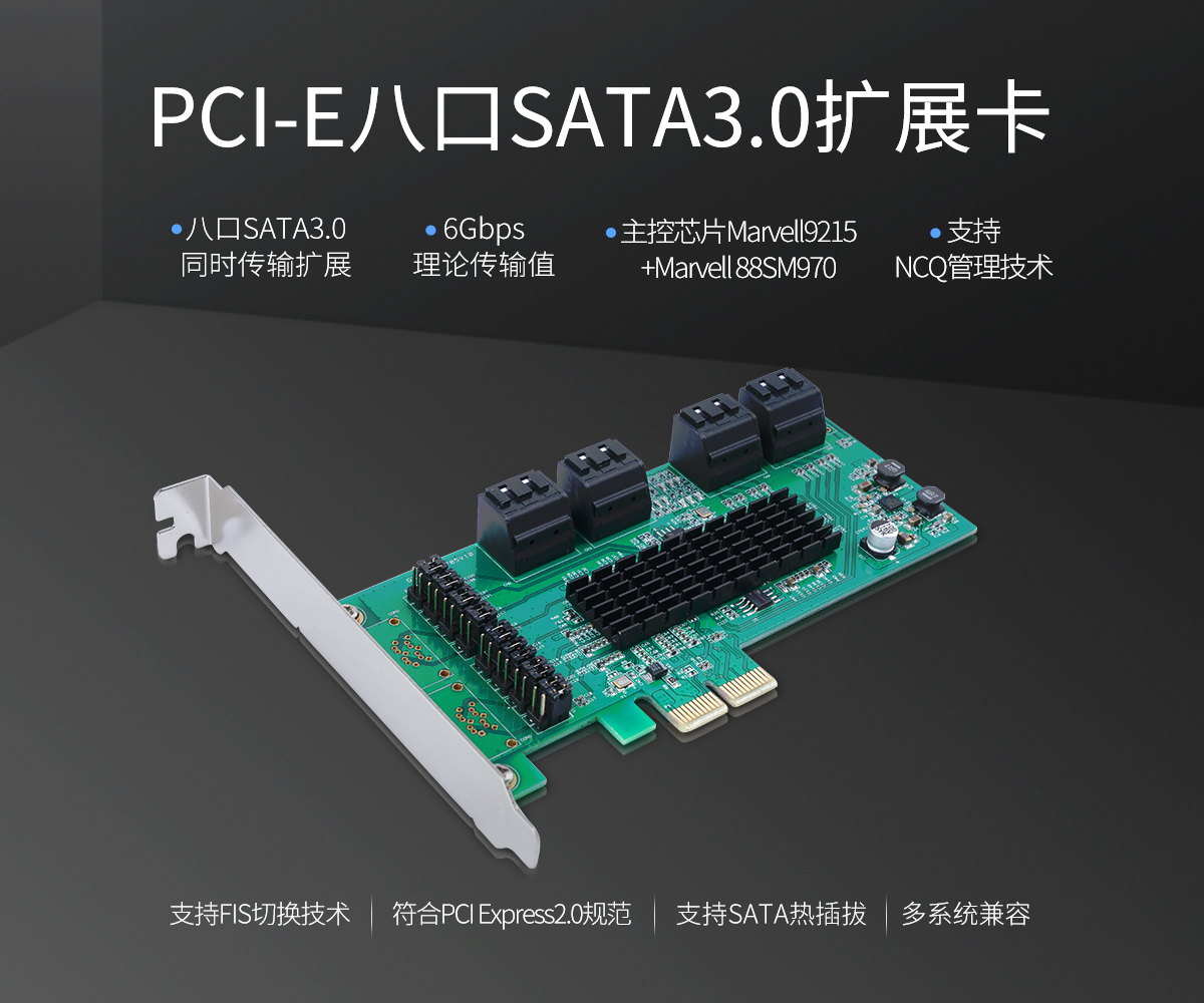 双芯片8口SATA3.0 PCI-E 扩展卡,兼容PCI-E X1/4/8/16