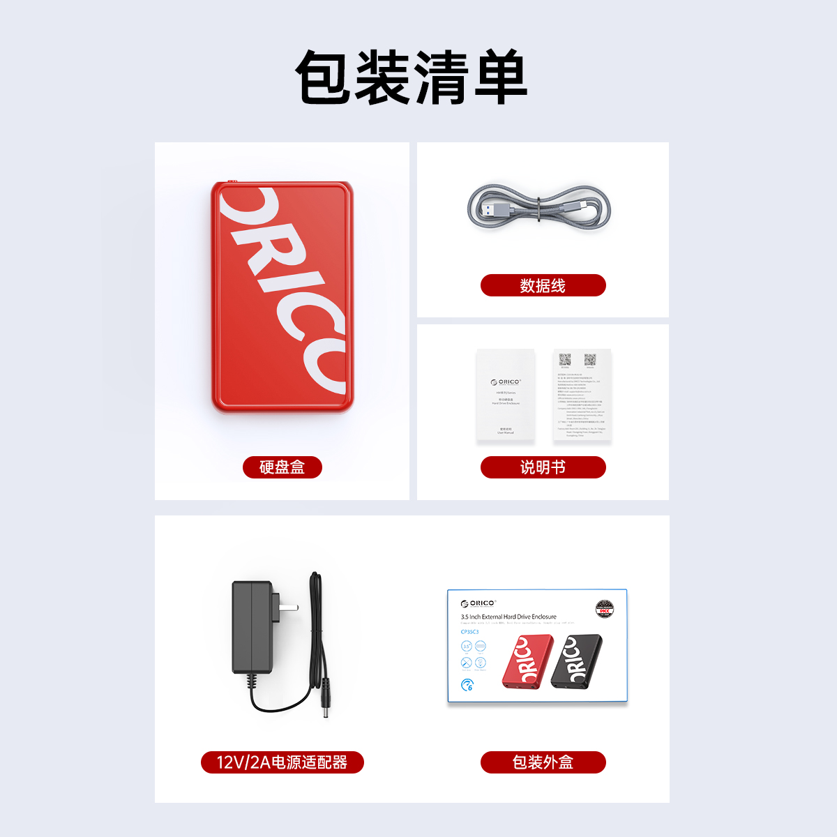 数据线(1M Ato C )*1、说明书*1、感谢卡*1、12V2A电源适配器*1、防震海绵*1