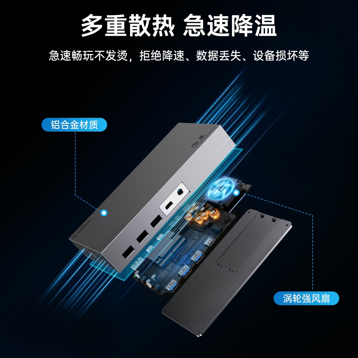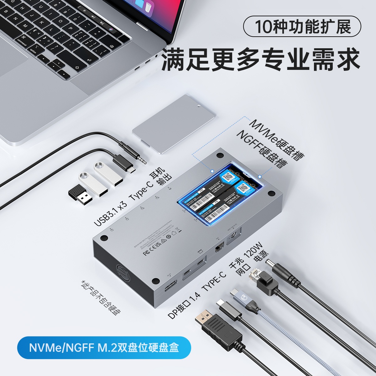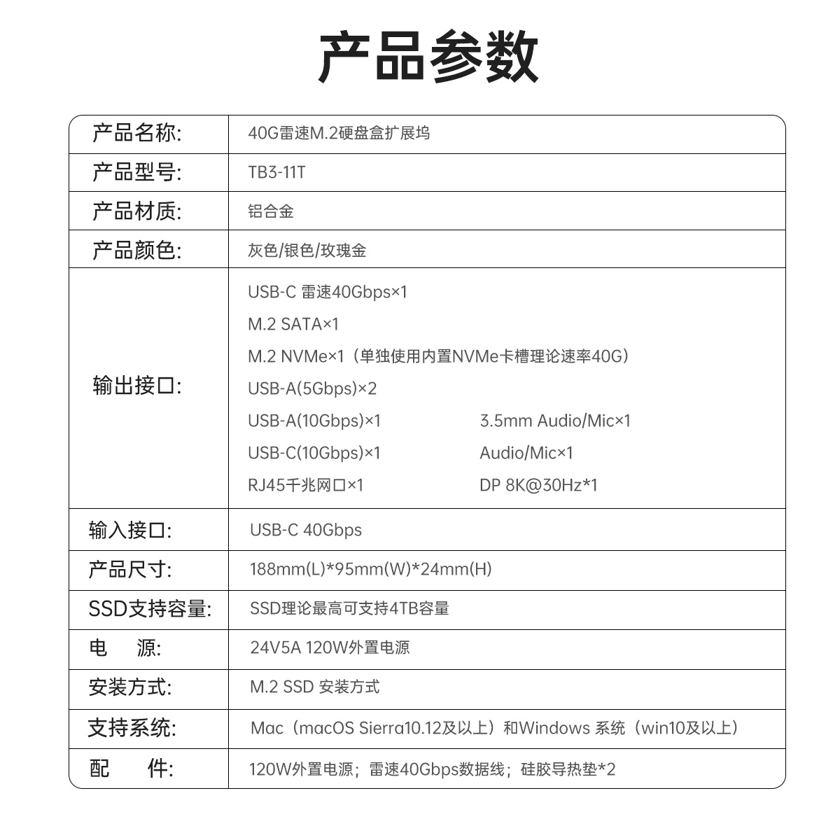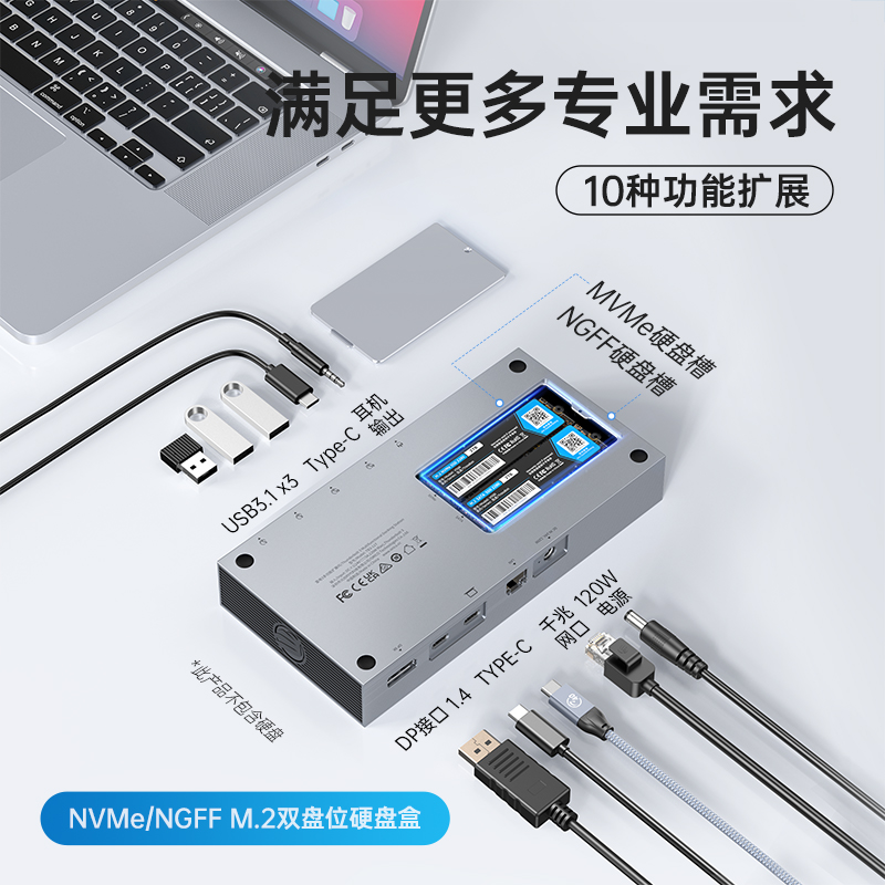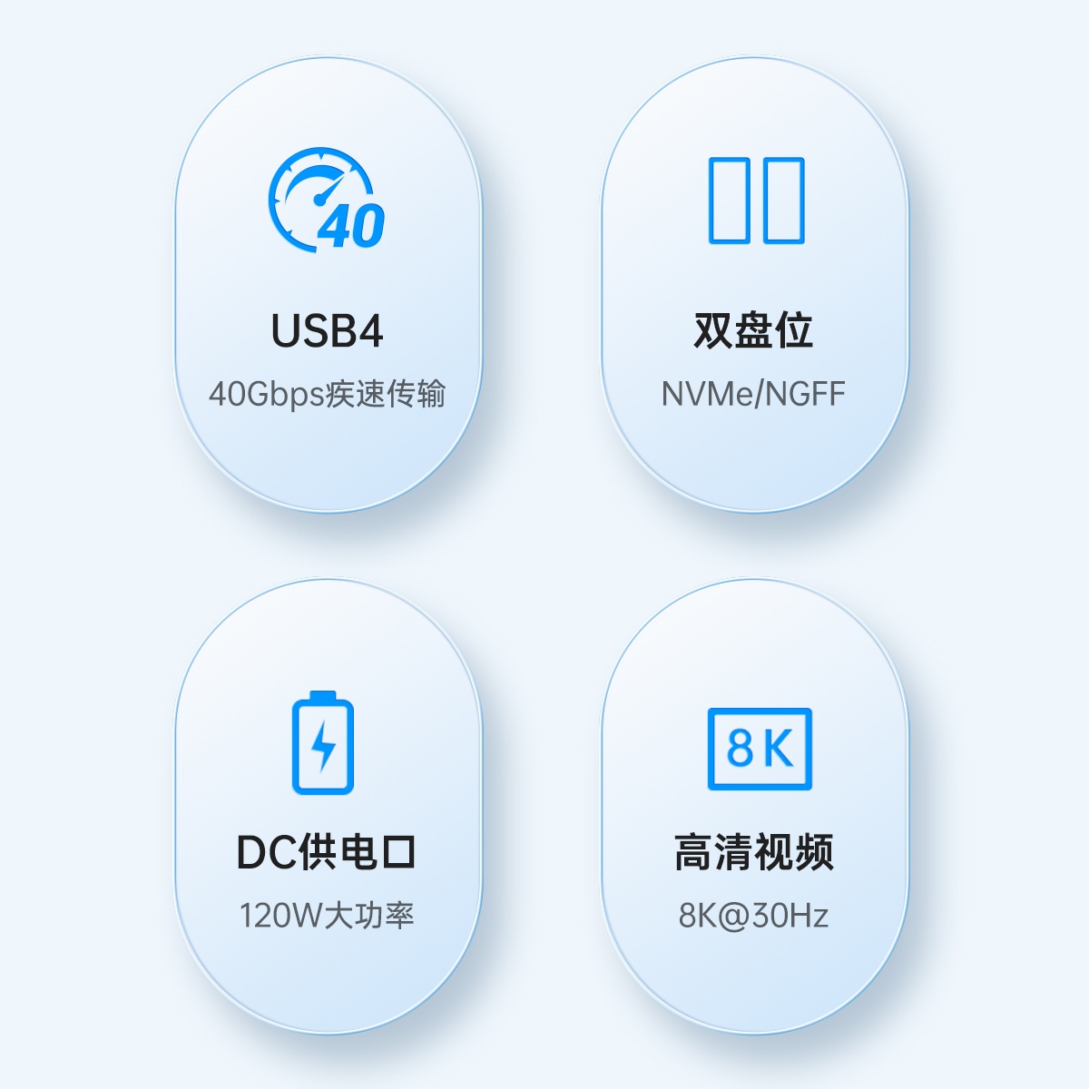 USB-C 雷速40Gbps×1、M.2 SATA×1、M.2 NVMe×1(单独使用内置NVMe卡槽理论速率40G)、USB-A(5Gbps)×2、USB-A(10Gbps)×1、USB-C(10Gbps)×1、RJ45千兆网口×1、3.5mm Audio/Mic×1、Audio/Mic×1、DP 8K@30Hz*1