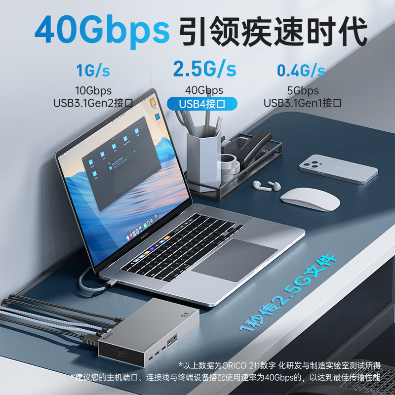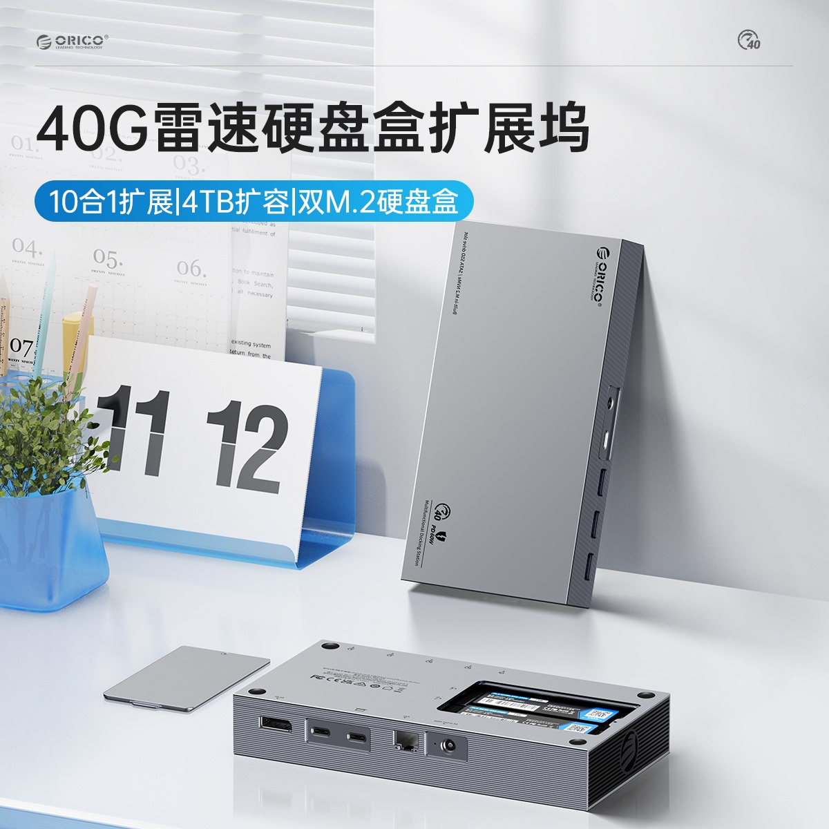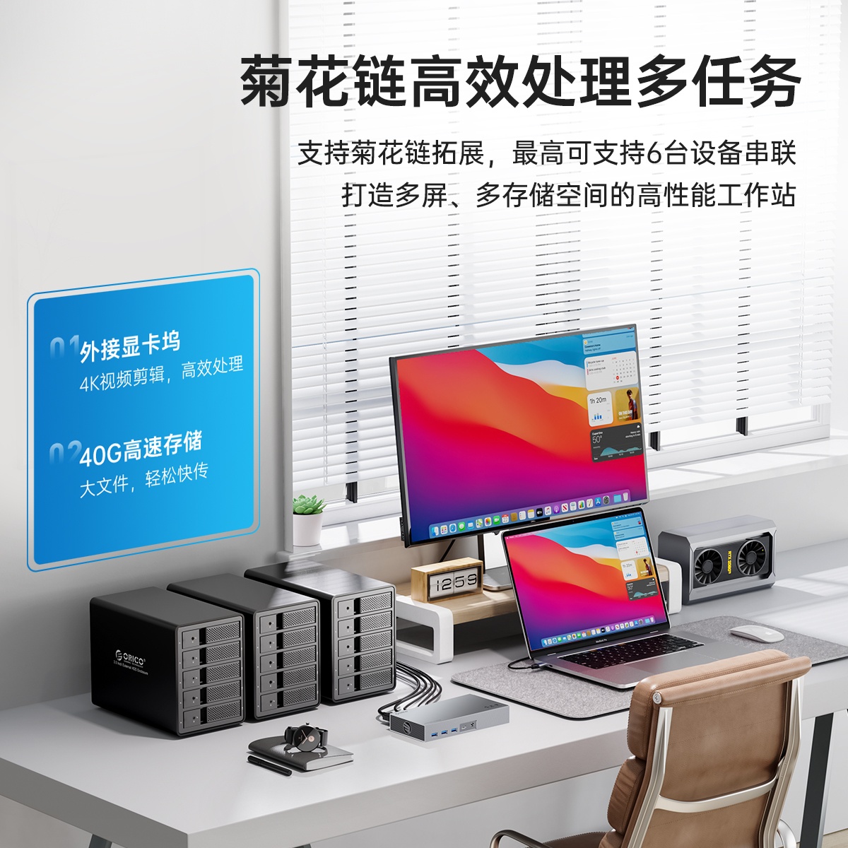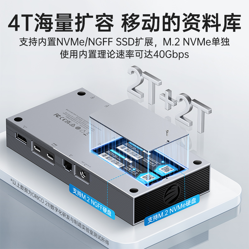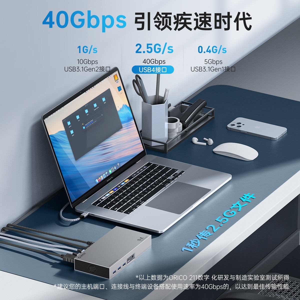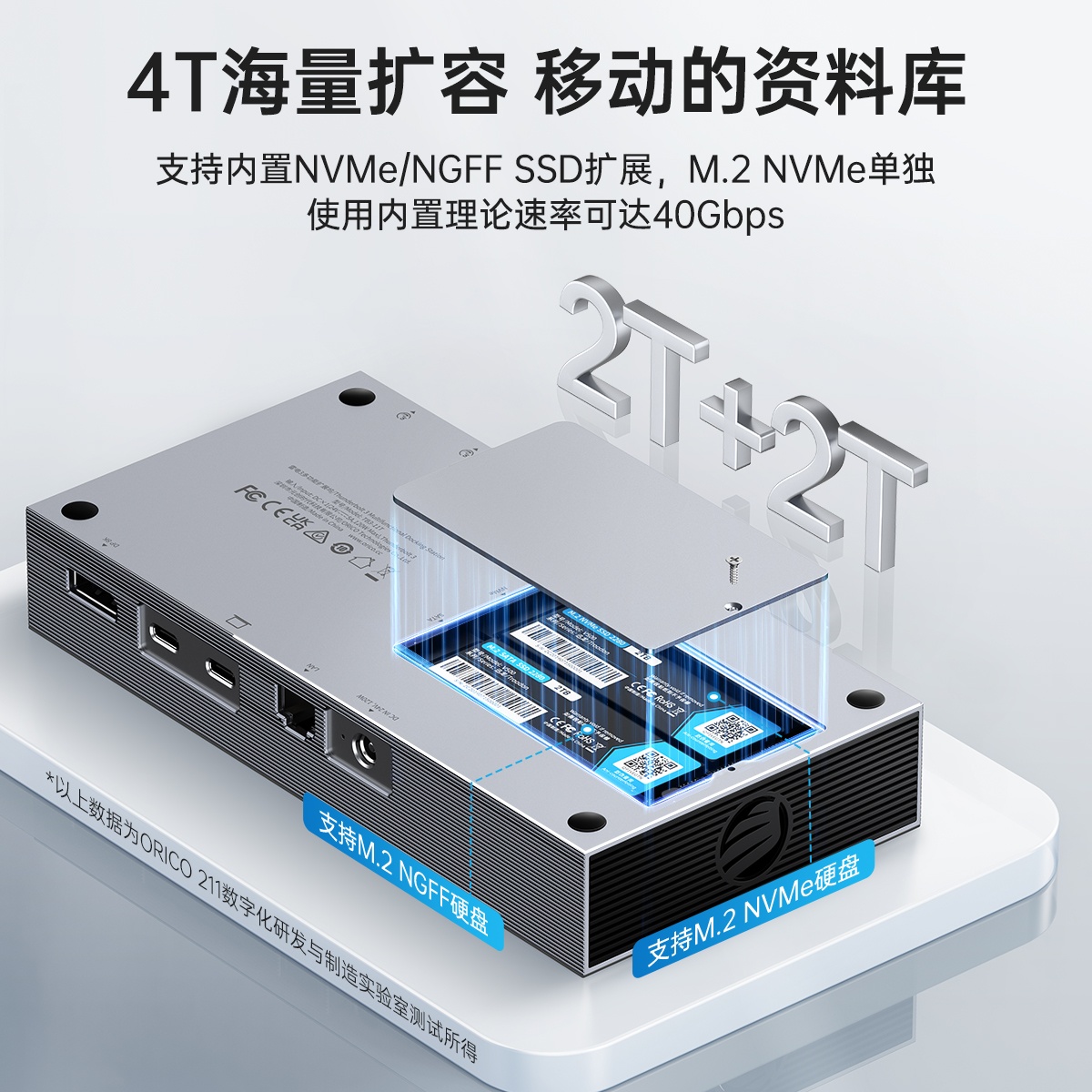 USB-C 雷速40Gbps×1、M.2 SATA×1、M.2 NVMe×1(单独使用内置NVMe卡槽理论速率40G)、USB-A(5Gbps)×2、USB-A(10Gbps)×1、USB-C(10Gbps)×1、RJ45千兆网口×1、3.5mm Audio/Mic×1、Audio/Mic×1、DP 8K@30Hz*1