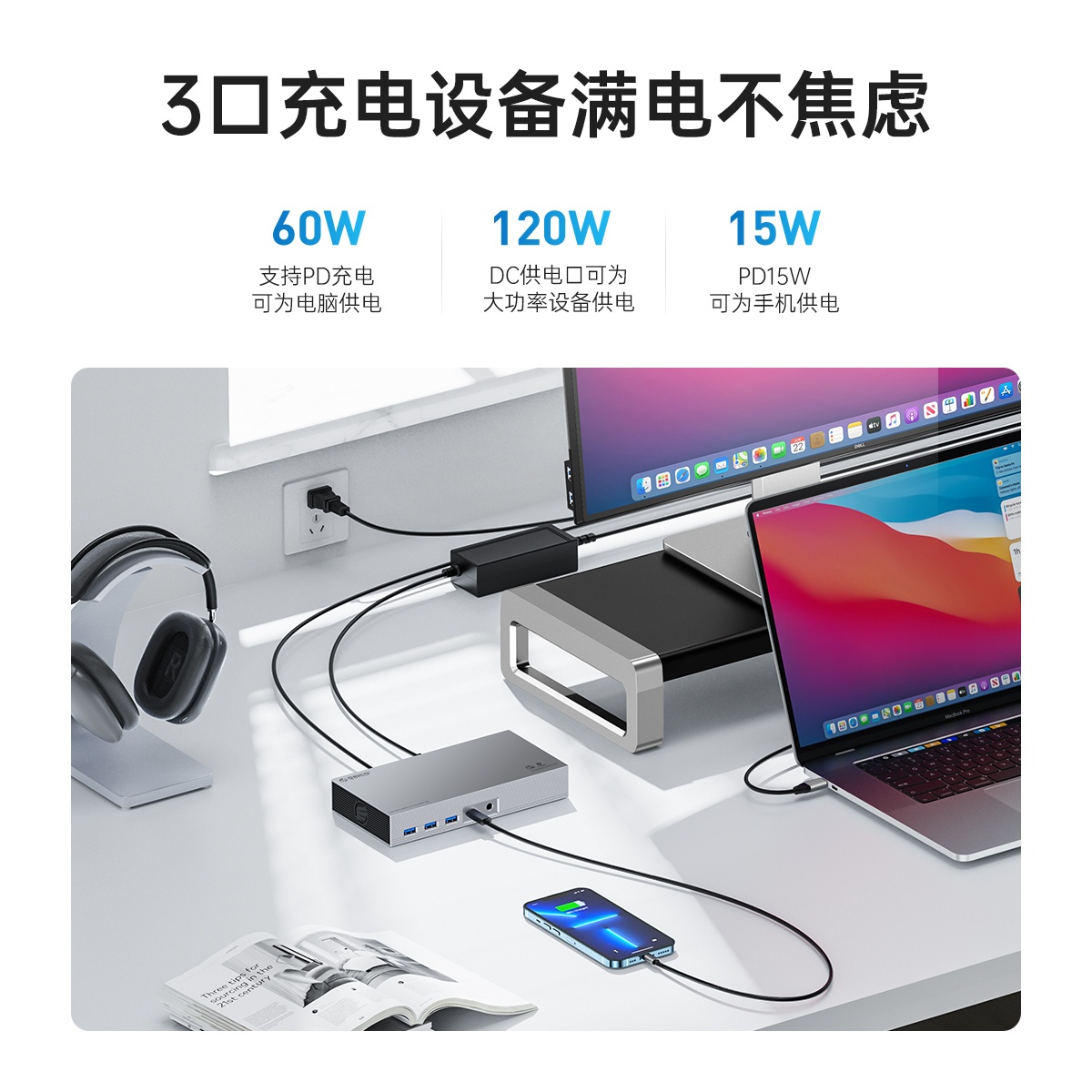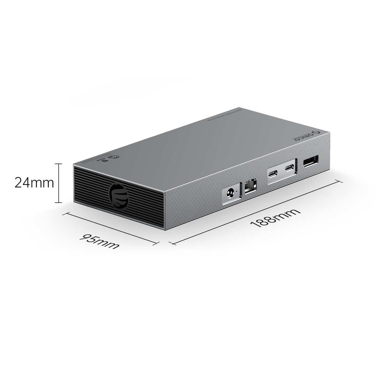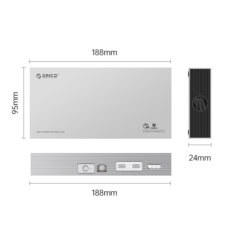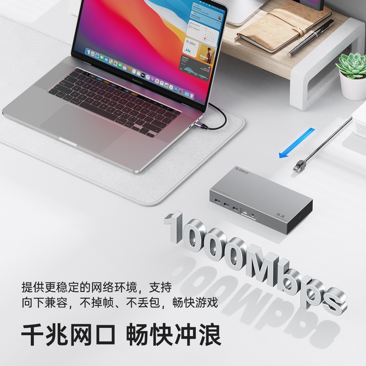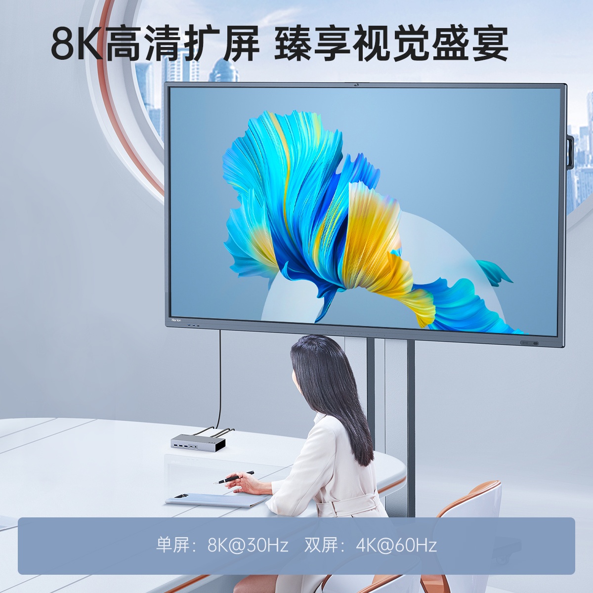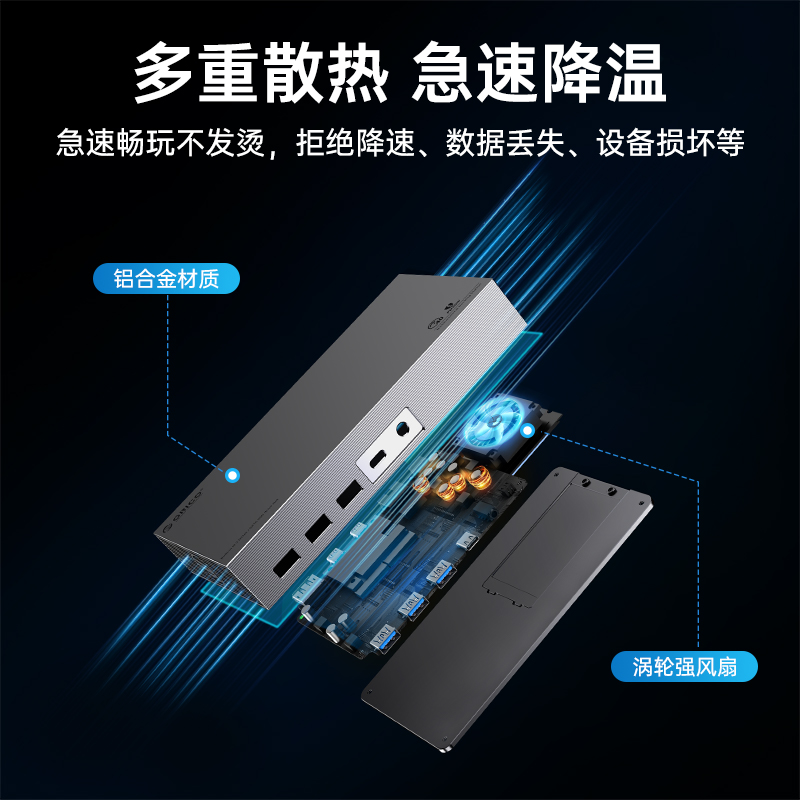 USB-C 雷速40Gbps×1、M.2 SATA×1、M.2 NVMe×1(单独使用内置NVMe卡槽理论速率40G)、USB-A(5Gbps)×2、USB-A(10Gbps)×1、USB-C(10Gbps)×1、RJ45千兆网口×1、3.5mm Audio/Mic×1、Audio/Mic×1、DP 8K@30Hz*1