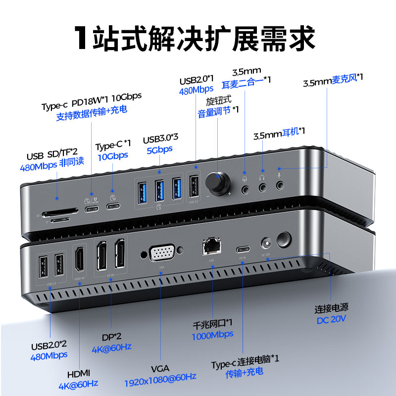 USB-C 3.2Gen2 PD18W*1、USB-C 3.2Gen2*1、USB-A 2.0*3、USB-A 3.0*3、RJ45 千兆*1、USB 2.0 SD/TF*2((非同读)、3.5mm耳机*1、3.5mm麦克风*1、3.5mm耳麦二合一*1、HDMI 4K@60Hz*1、VGA 1920x1080@60Hz*1 、DP 4K@60Hz*2、旋钮式音量调节 *1、DC电源:20V3.25A 65W