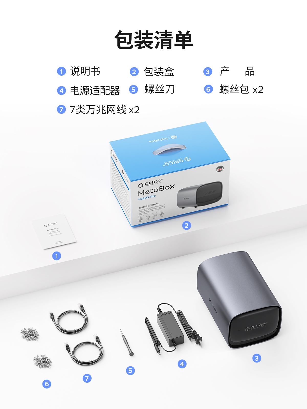 产品主体x1, 电源适配器x1, 7类万兆网线x2, 螺丝刀x1, 螺丝包x2, 说明书x1