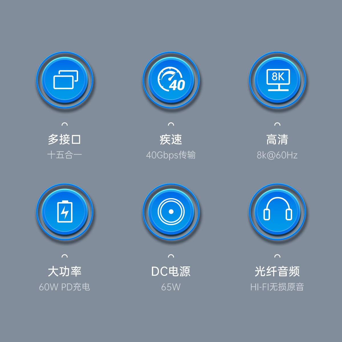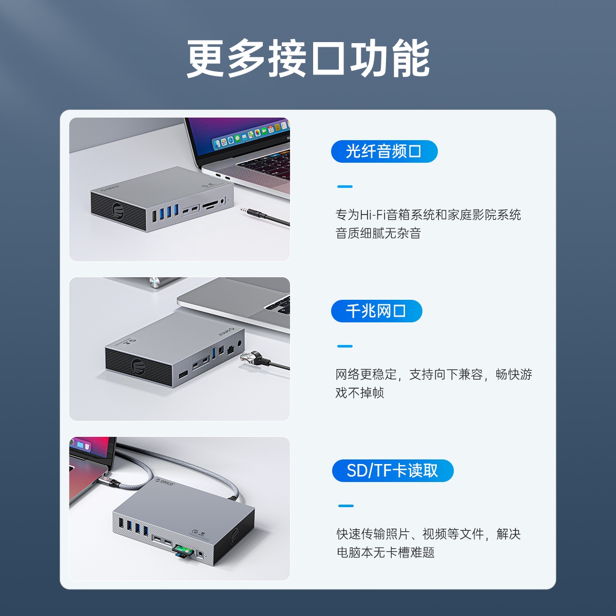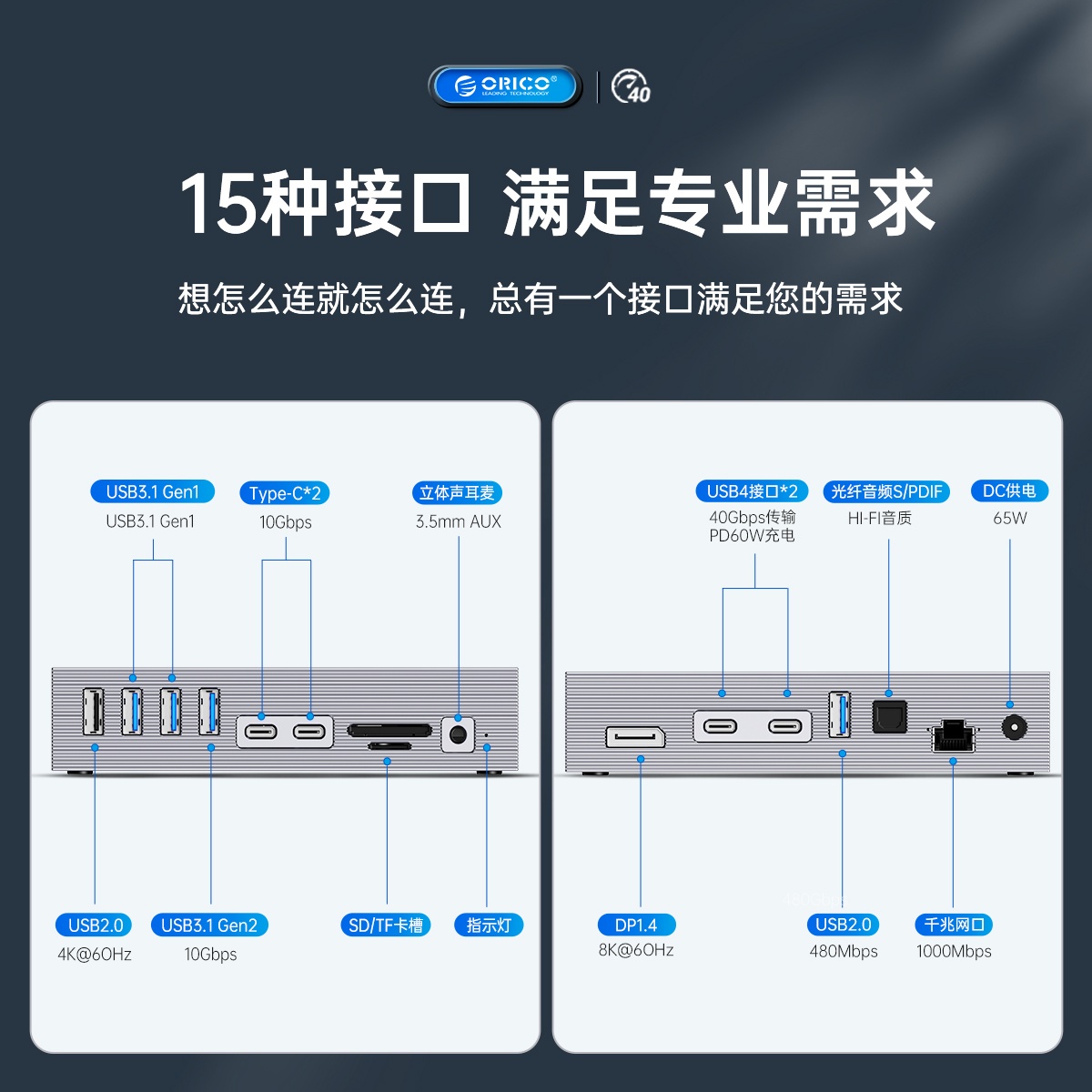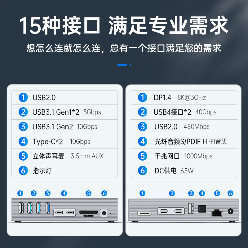 USB-C 雷速40Gbpsx1、USB-C(10Gbps)x2、USB-A(10Gbps)x1、USB-A(5Gbps)x2、USB-A2.0x2、RJ45千兆网口x1、3.0SD/TF读卡器(同读)x2、3.5mm Audio/Micx1、S/PDIFx1、DP 8K@30Hz*1