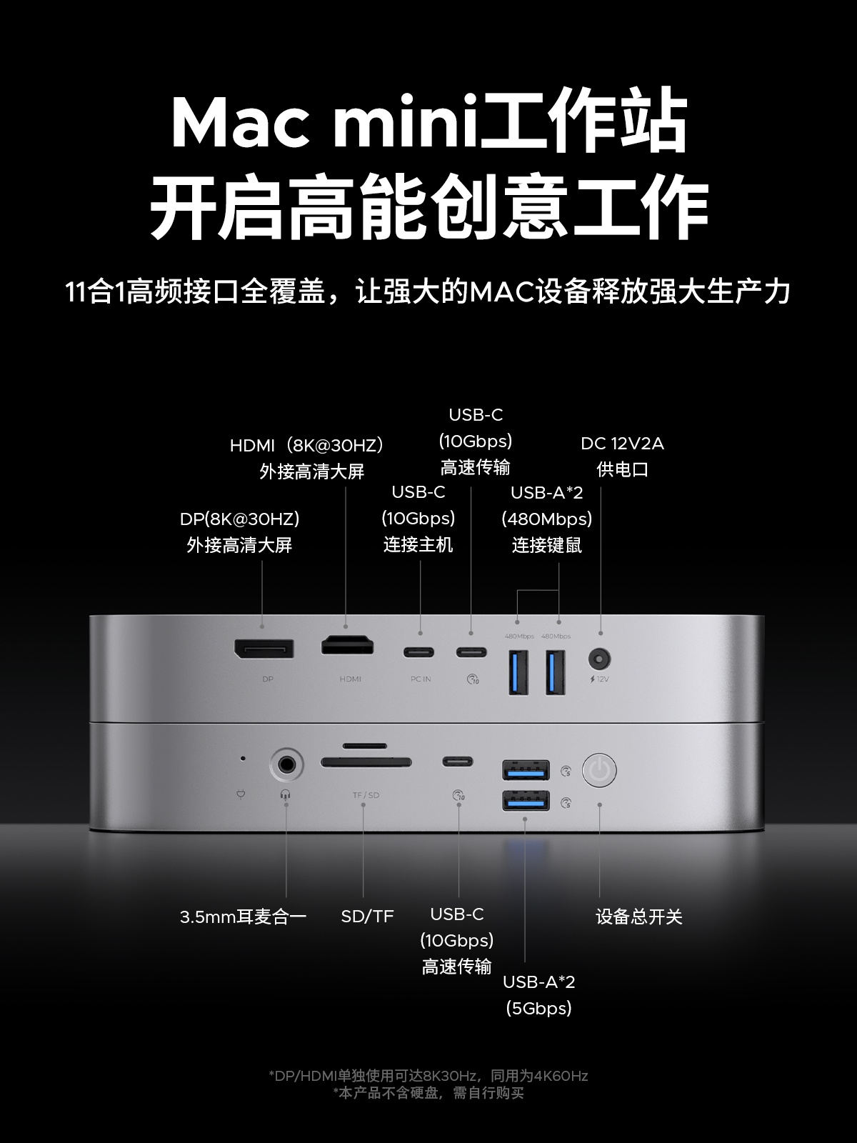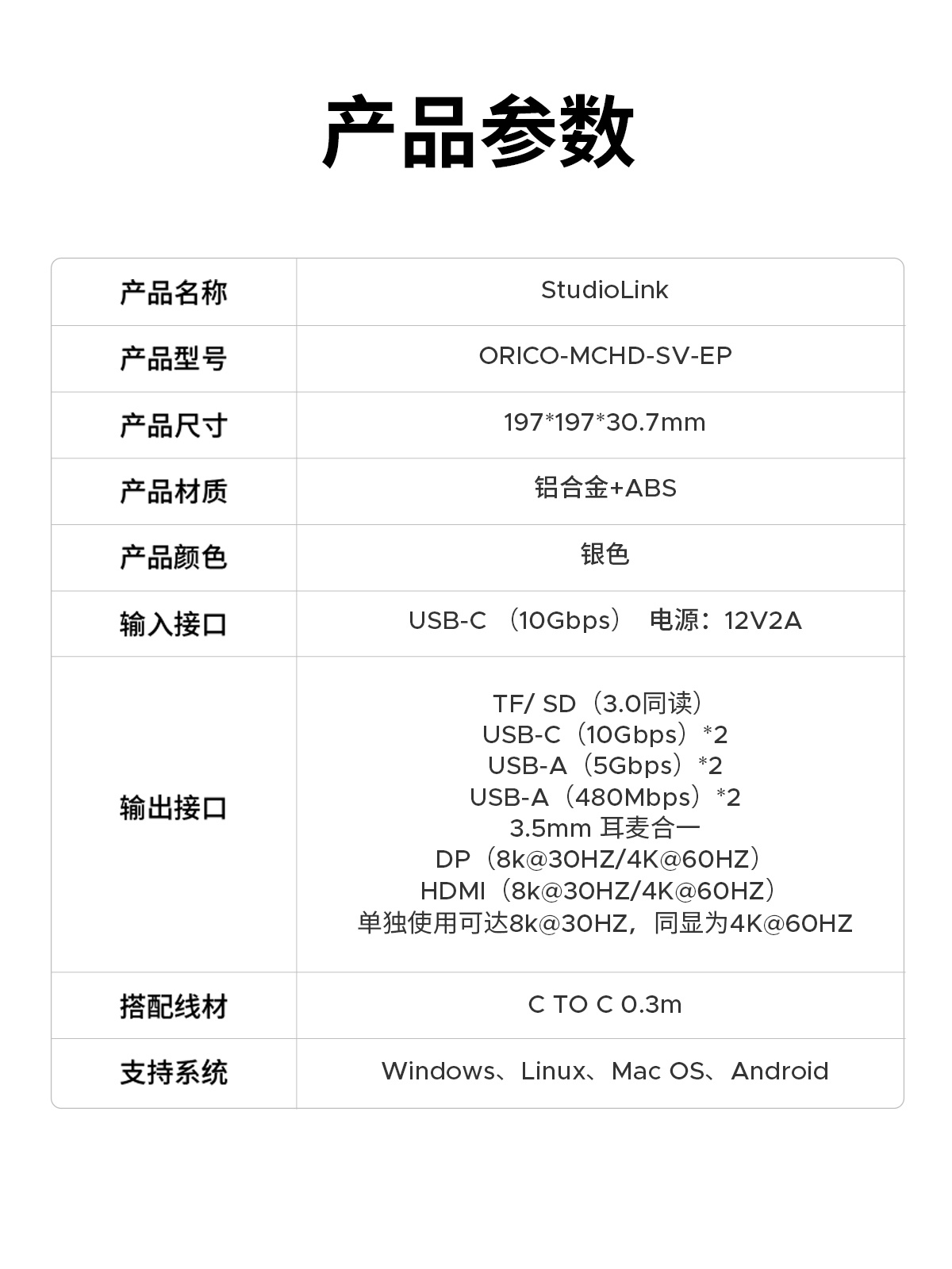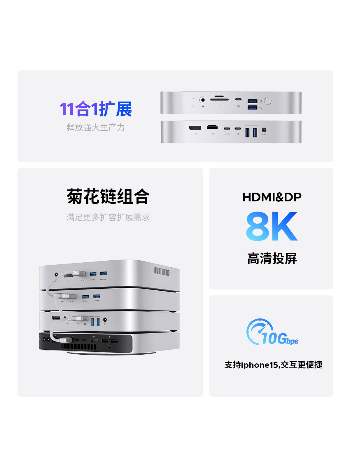 TF/ SD(3.0同读)、USB-C(10Gbps)*2、USB-A(5Gbps)*2、USB-A(480Mbps)*2、3.5mm 耳麦合一、DP(8k@30HZ/4K@60HZ)、HDMI(8k@30HZ/4K@60HZ)、单独使用可达8k@30HZ,同显为4K@60HZ