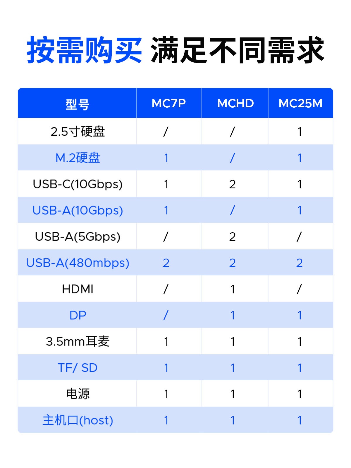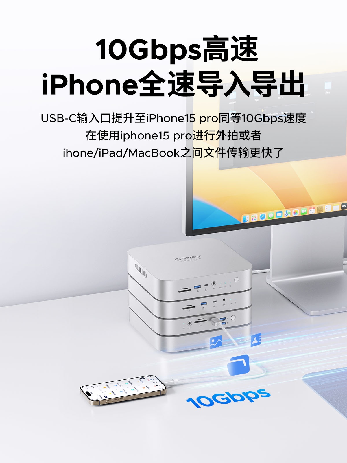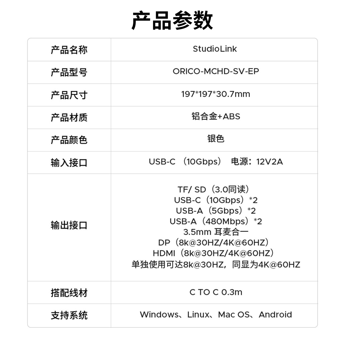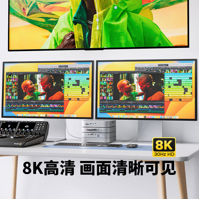 TF/ SD(3.0同读)、USB-C(10Gbps)*2、USB-A(5Gbps)*2、USB-A(480Mbps)*2、3.5mm 耳麦合一、DP(8k@30HZ/4K@60HZ)、HDMI(8k@30HZ/4K@60HZ)、单独使用可达8k@30HZ,同显为4K@60HZ