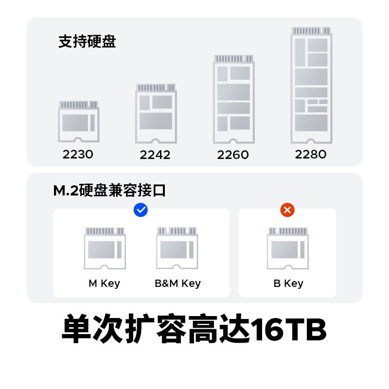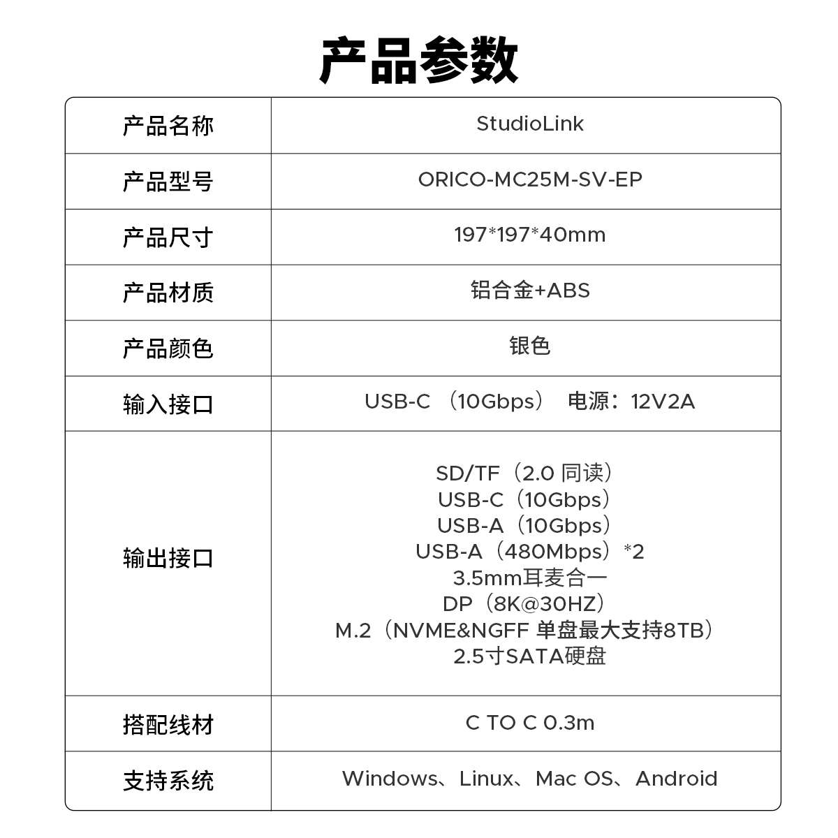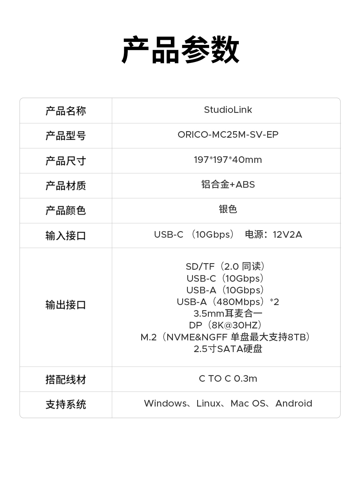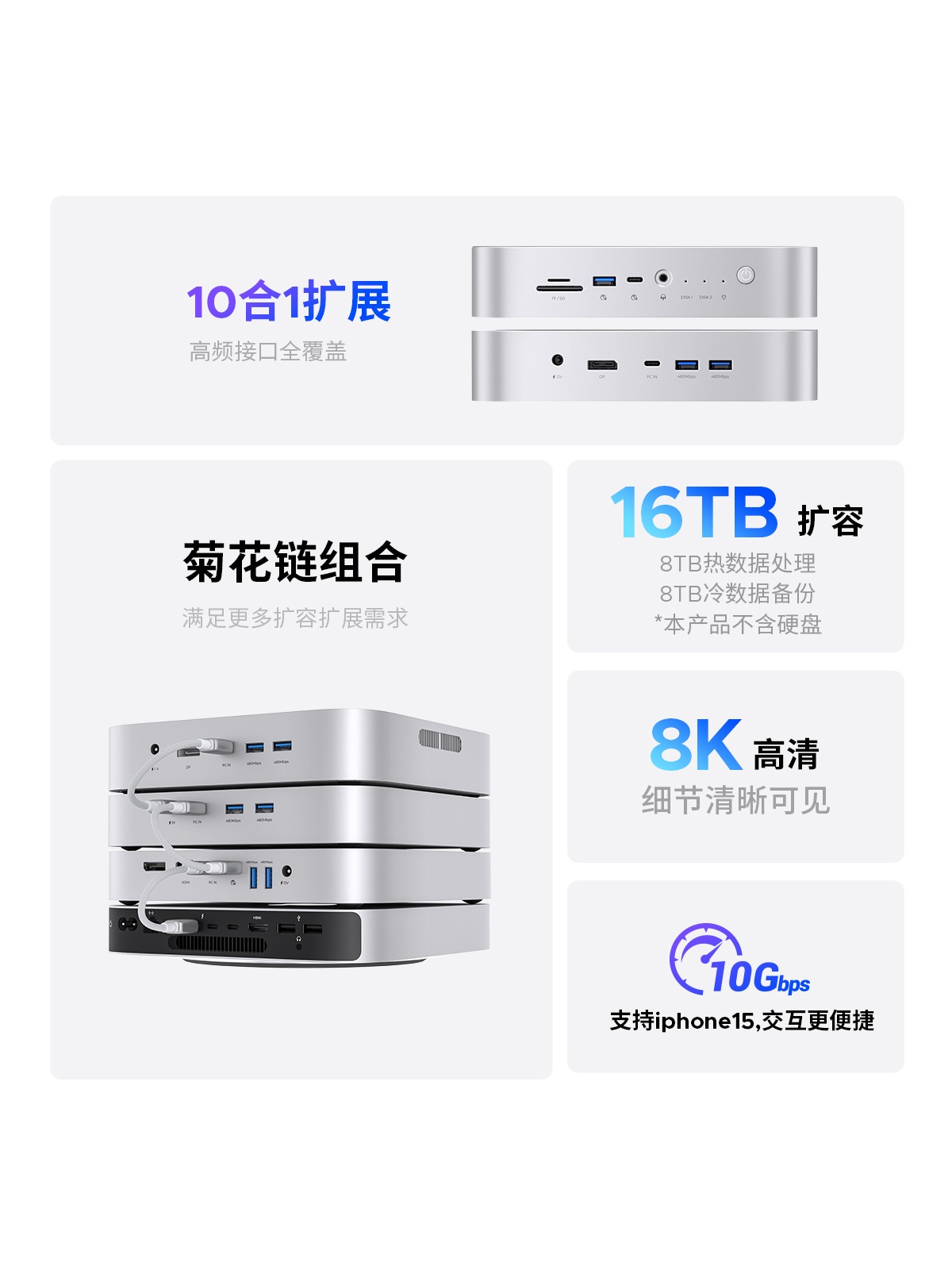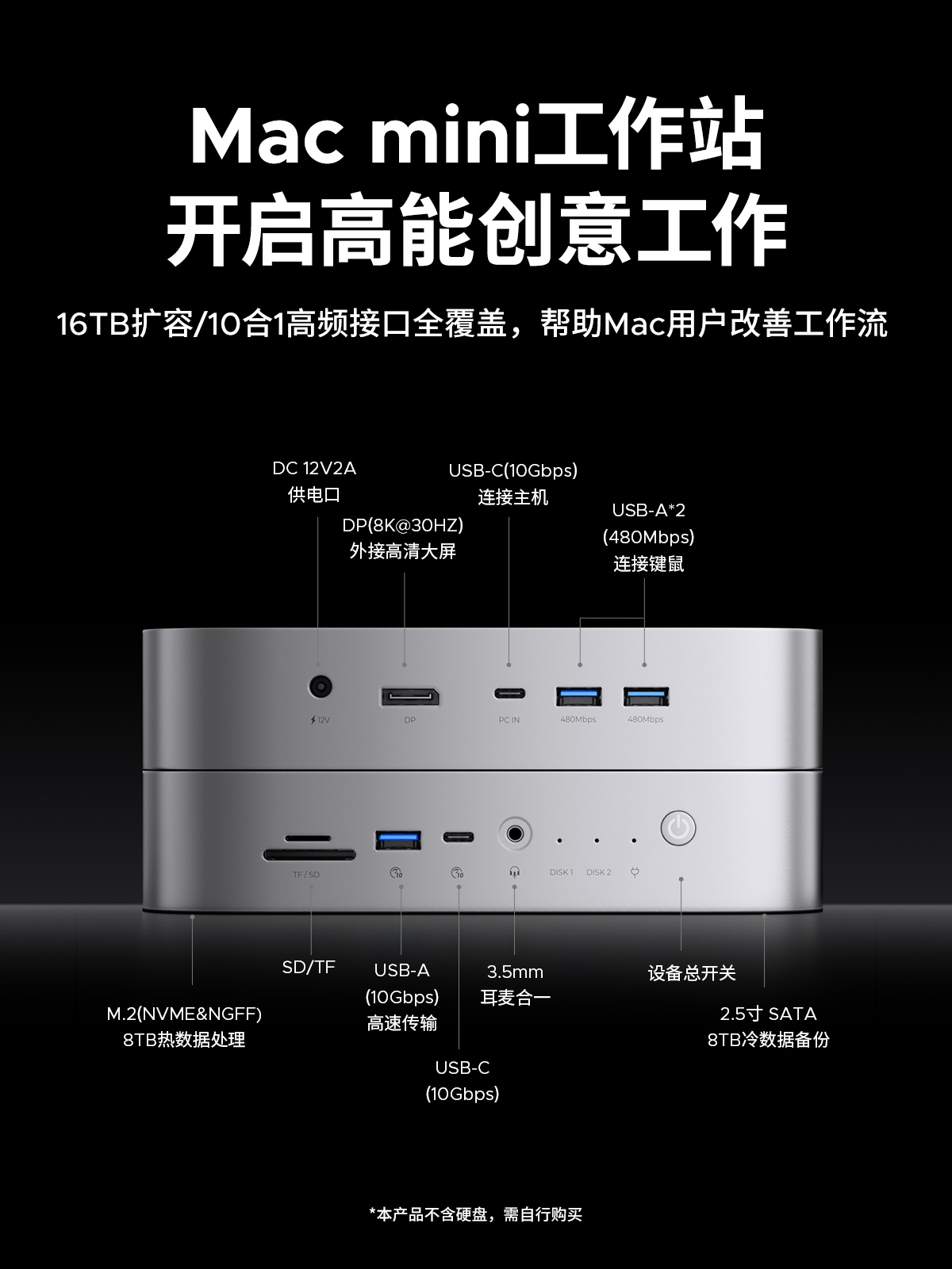 SD/TF(2.0 同读)、USB-C(10Gbps)、USB-A(10Gbps)、USB-A(480Mbps)*2、3.5mm耳麦合一、DP(8K@30HZ)、M.2(NVME&NGFF)、2.5寸SATA硬盘