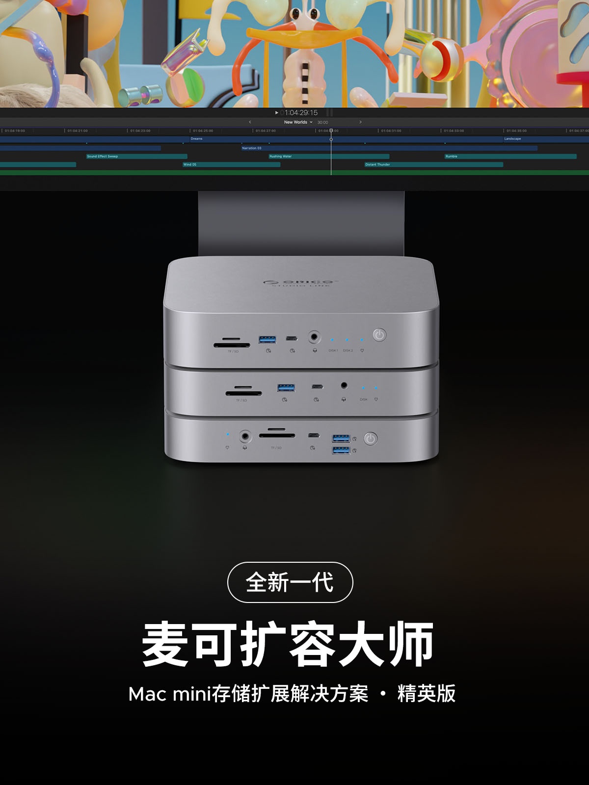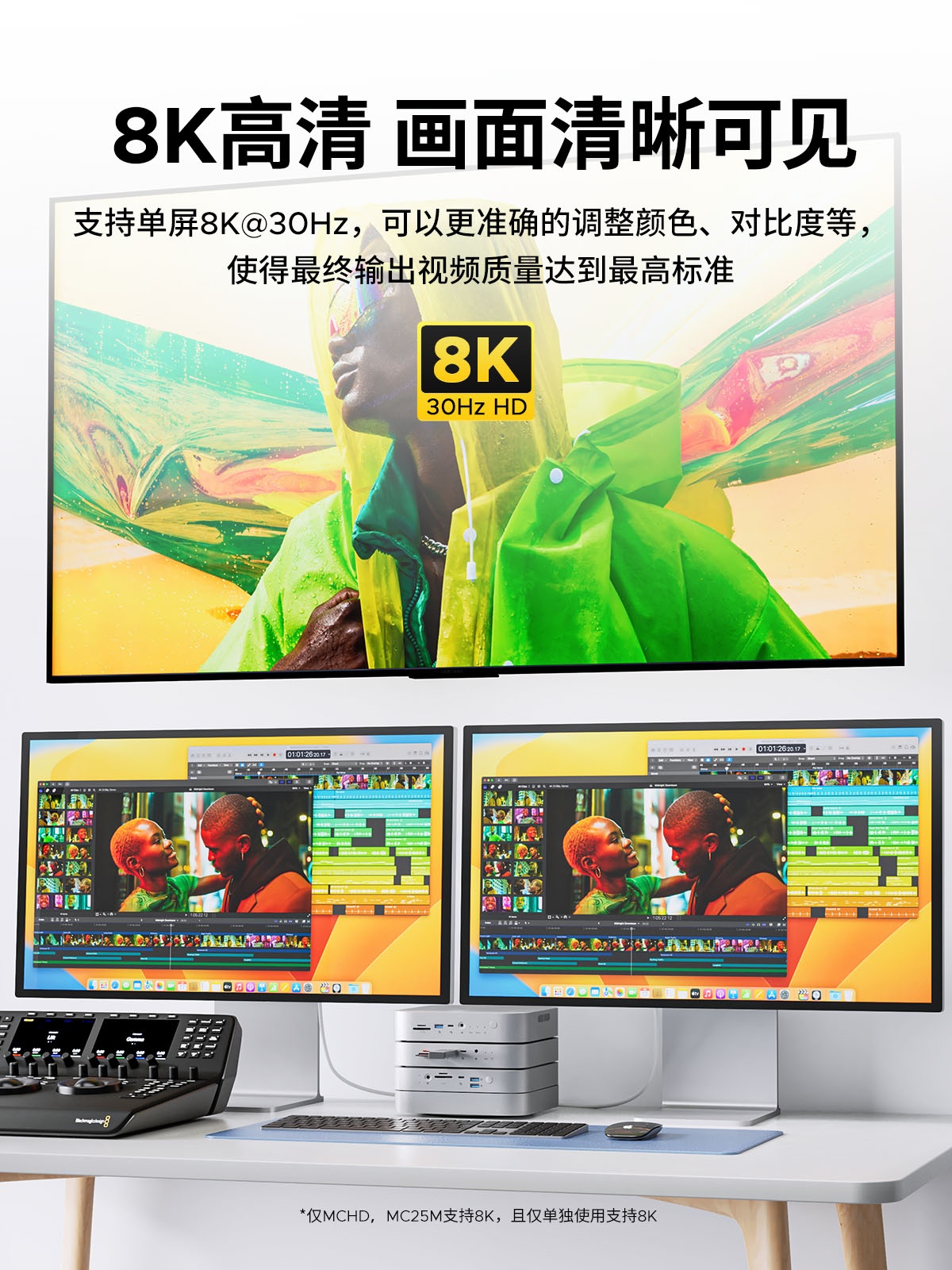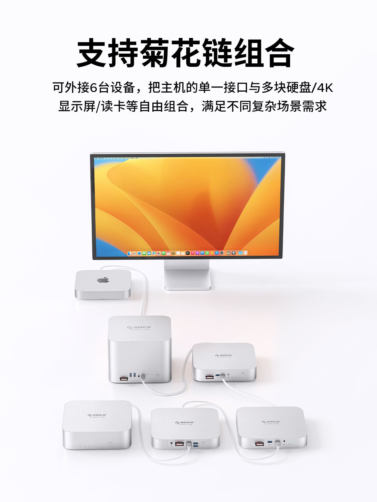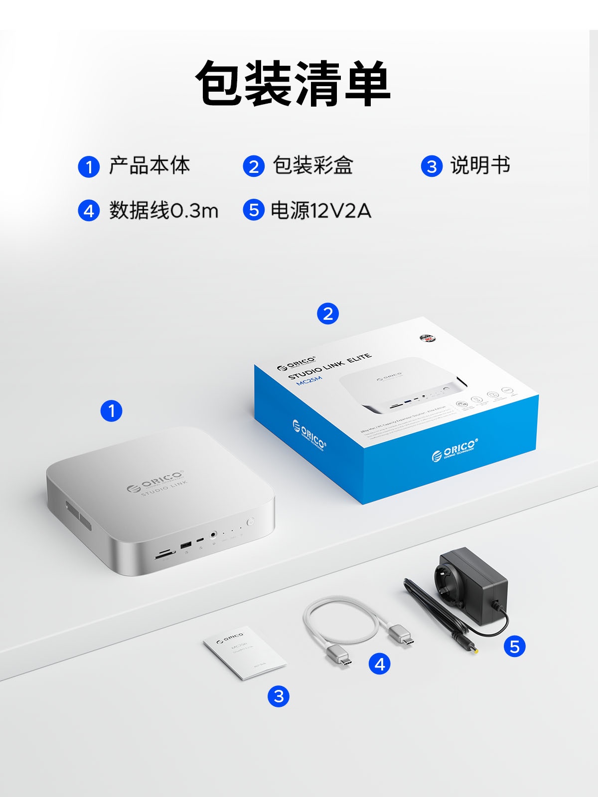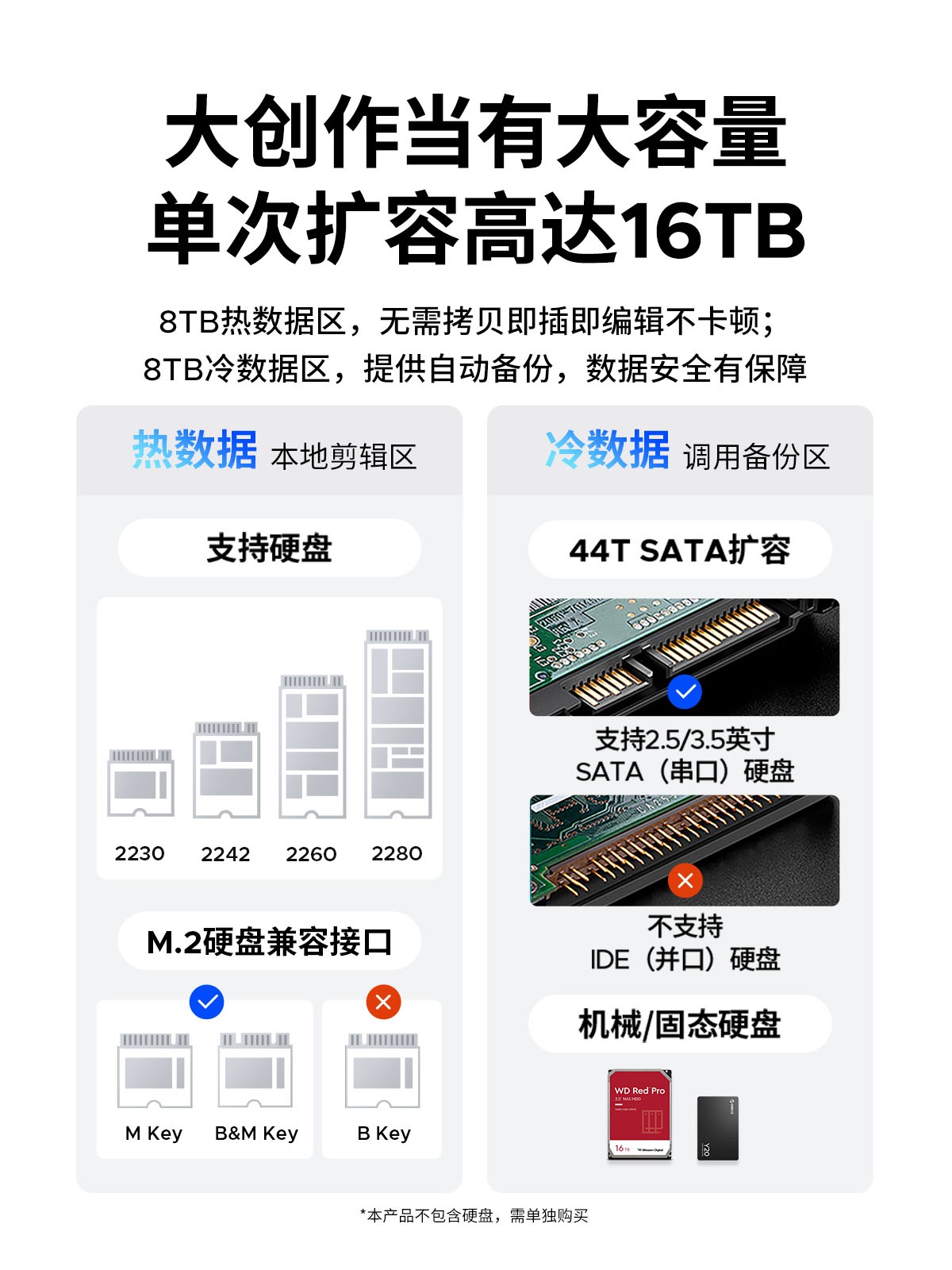 SD/TF(2.0 同读)、USB-C(10Gbps)、USB-A(10Gbps)、USB-A(480Mbps)*2、3.5mm耳麦合一、DP(8K@30HZ)、M.2(NVME&NGFF)、2.5寸SATA硬盘