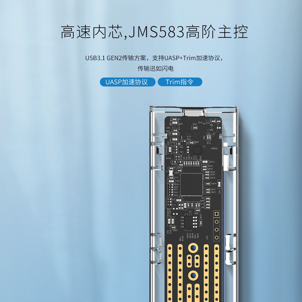 采用了JMS583主控芯片;自带有金属散热片和散热的硅胶垫片。拥有2根数据线分别支持(U**-C to U**-A:5Gbps)和(U**-C to U**-C:10Gbps),也只有在U**-C to U**-C接口下的U** 3.1 Gen 2才可以发挥出高速读写的速度。透明外壳在使用时间久了容易出现刮花的情况。长时间传输数据会发热明显,在进行高速读写数据传输后触摸可以明显感知到烫手的情况。